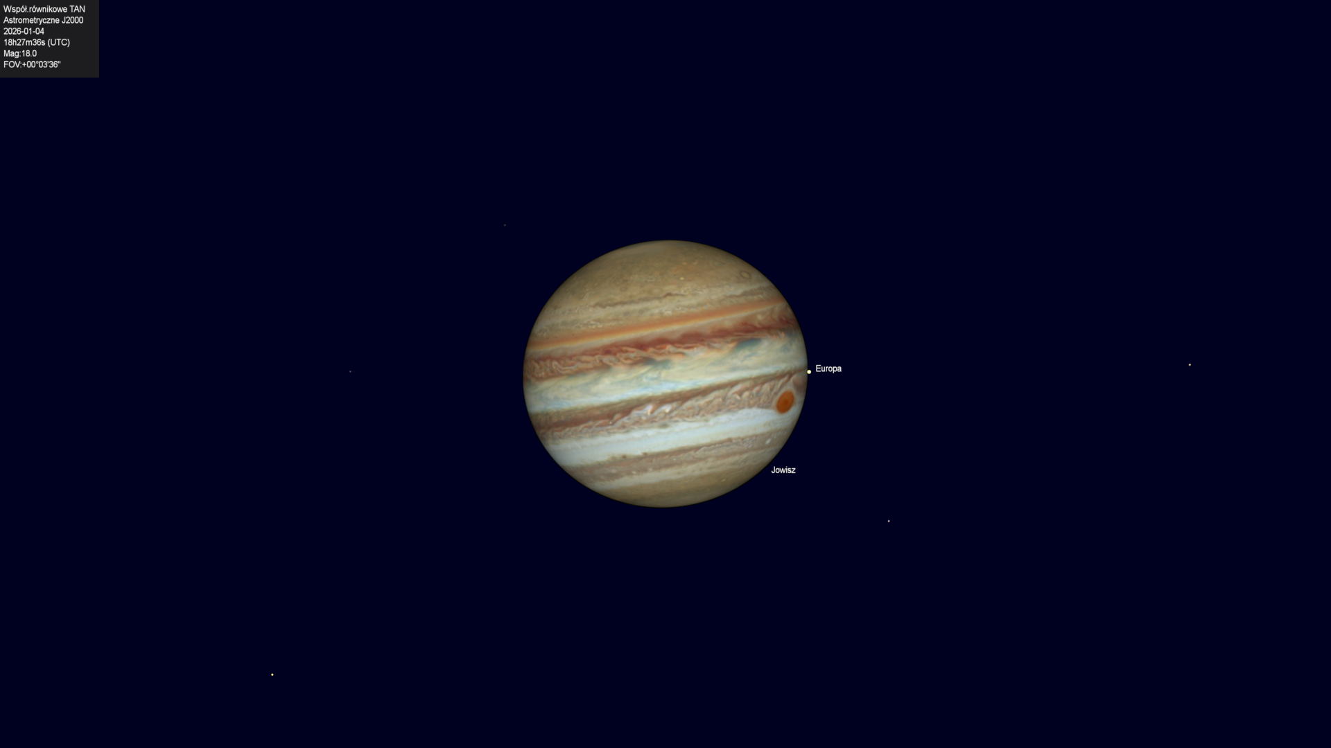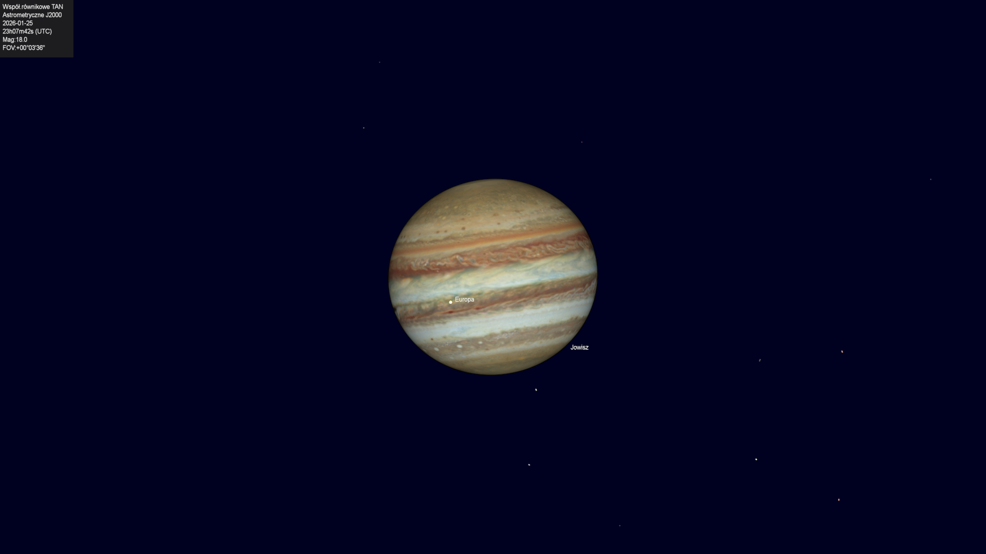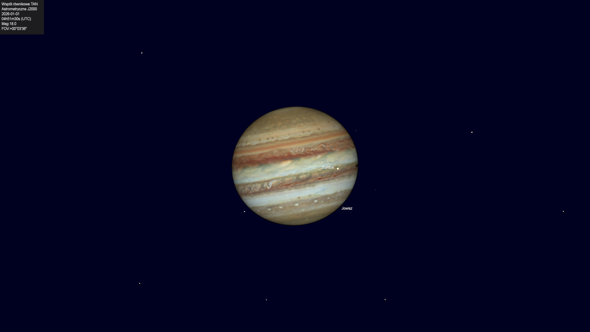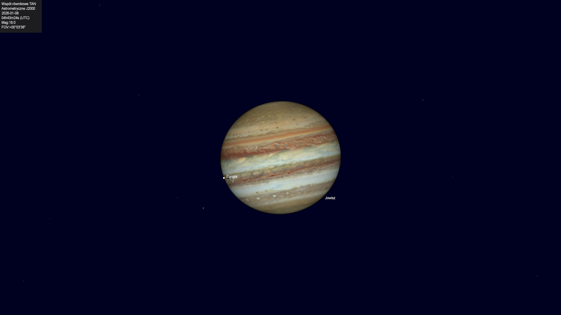 Koniec zakrycia księżyca Europy przez tarczę planety.