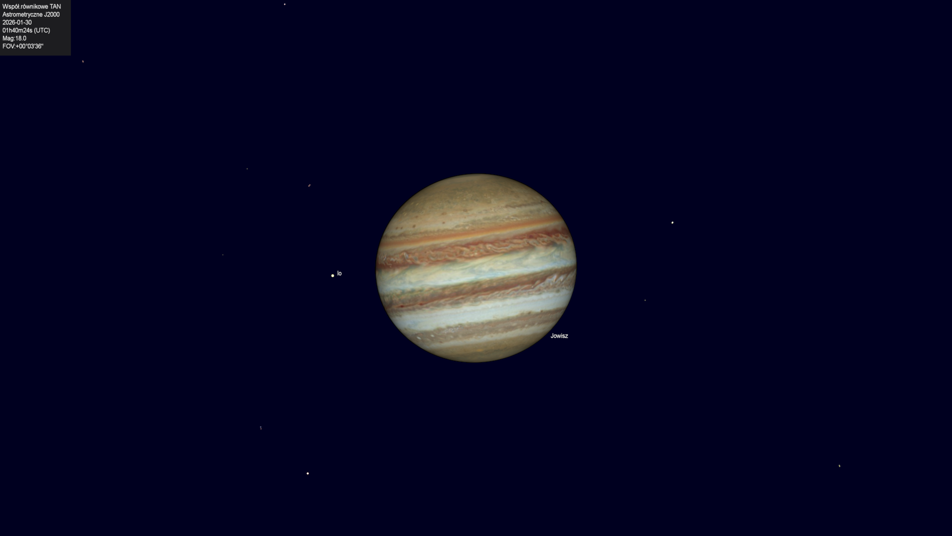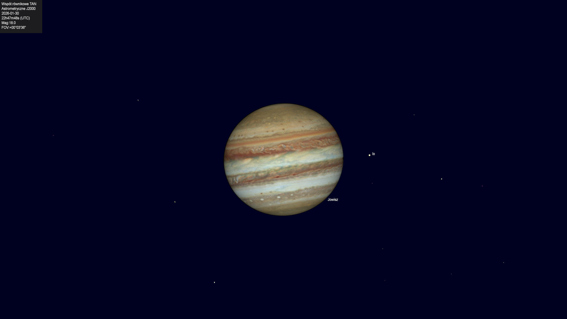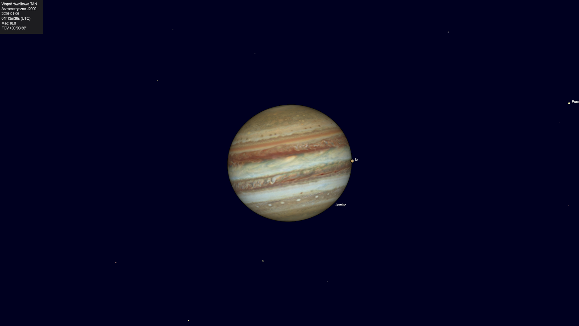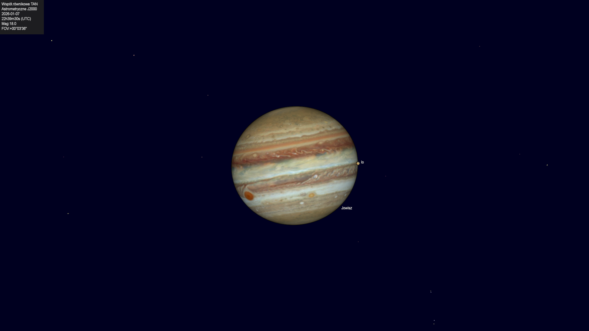 Koniec zakrycia księżyca Io przez tarczę planety.