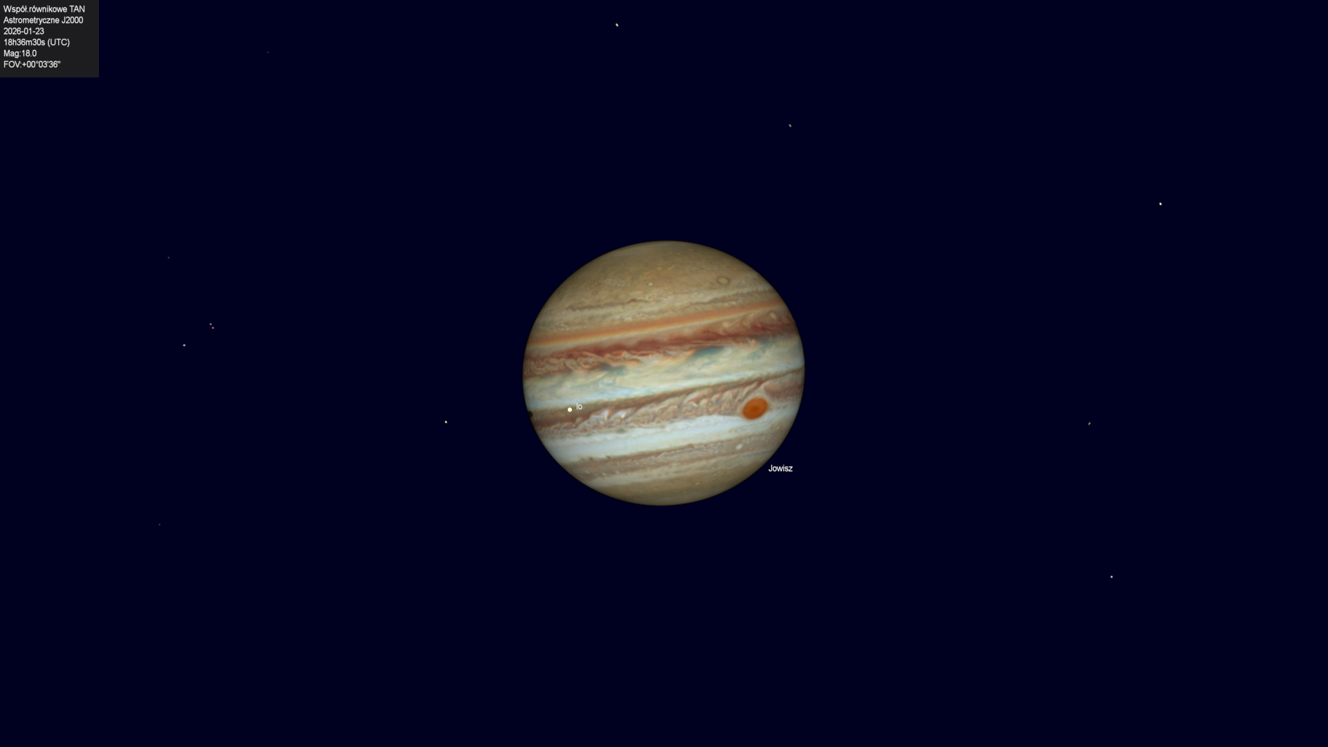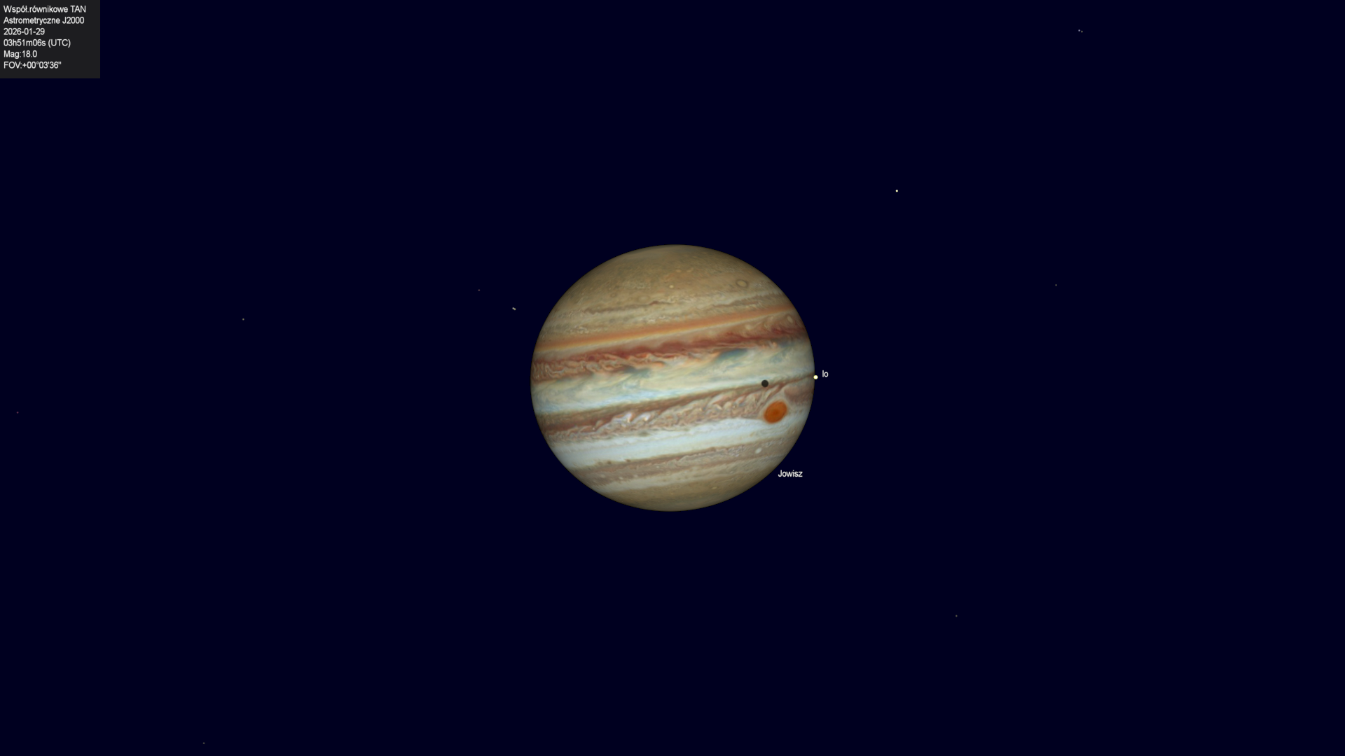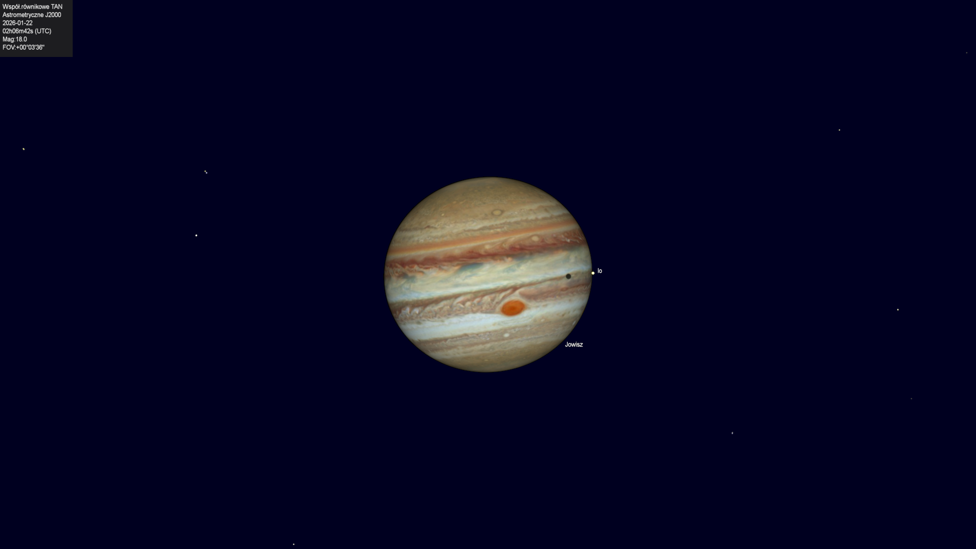 Koniec przejścia cienia księżyca Io na tle tarczy planety.