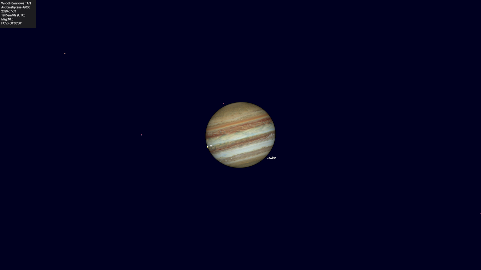 Początek przejścia cienia księżyca Europy na tle tle tarczy planety.