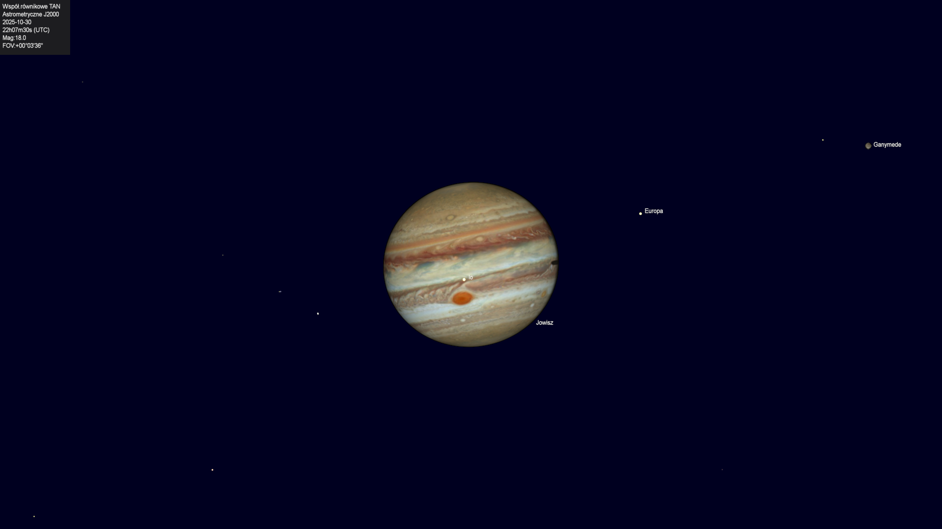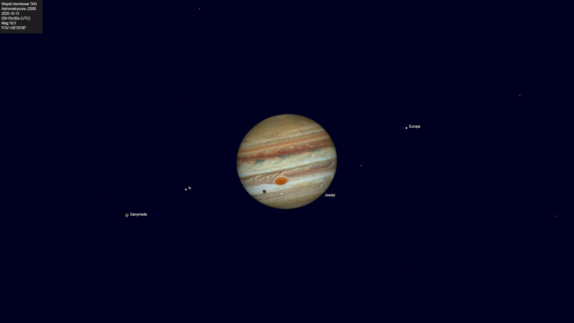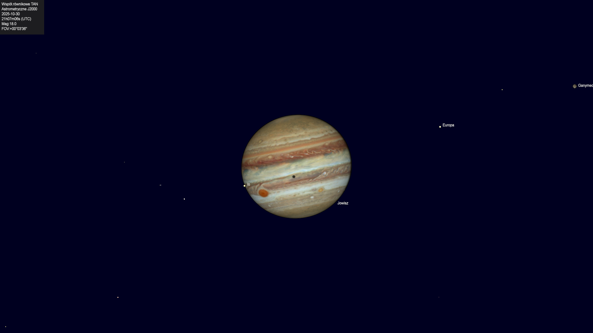 Koniec przejścia cienia księżyca Io na tle tarczy planety.