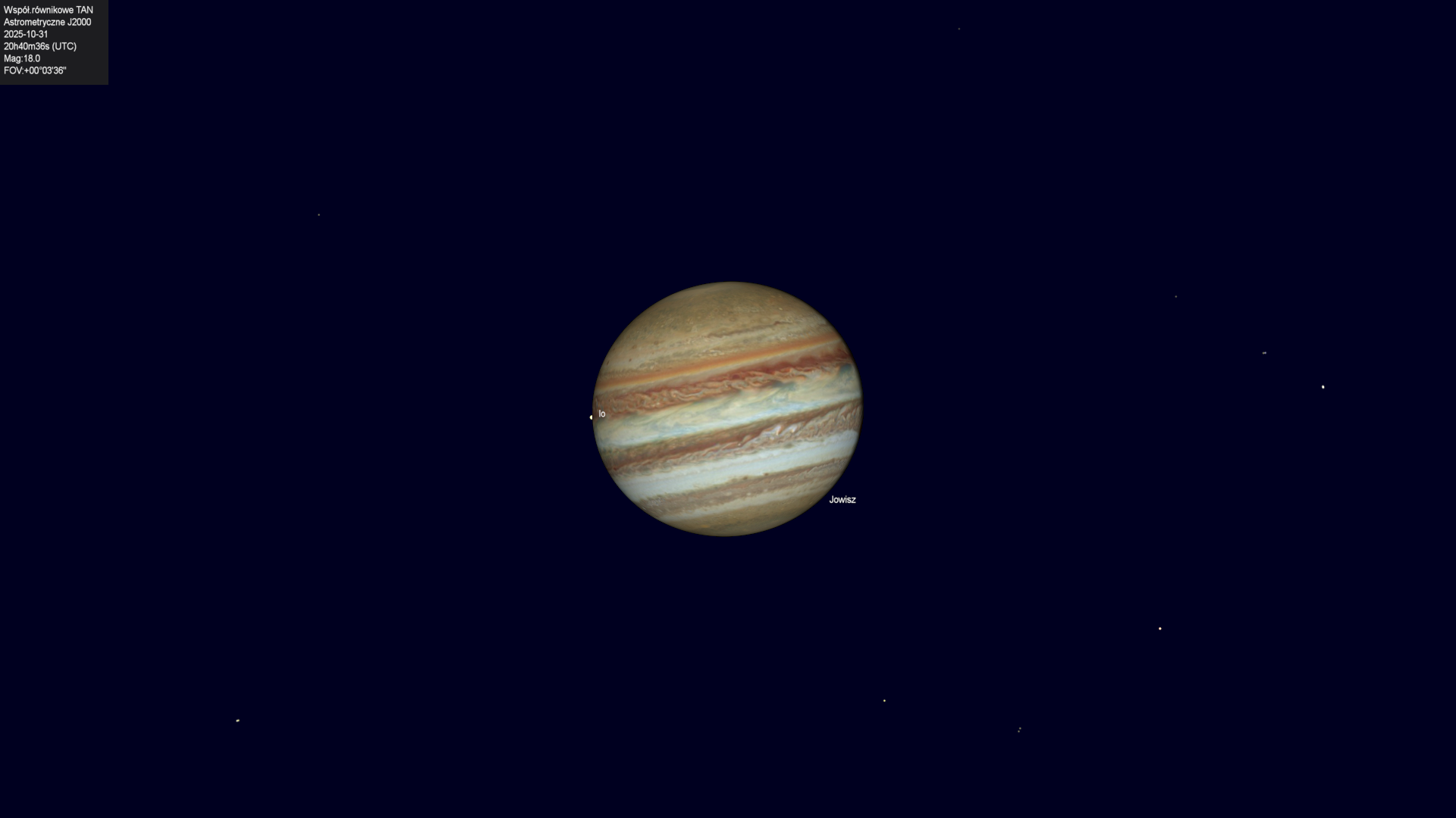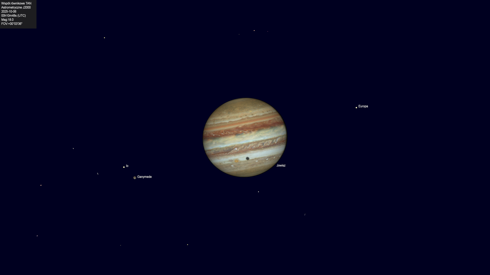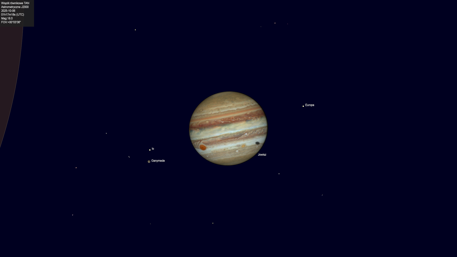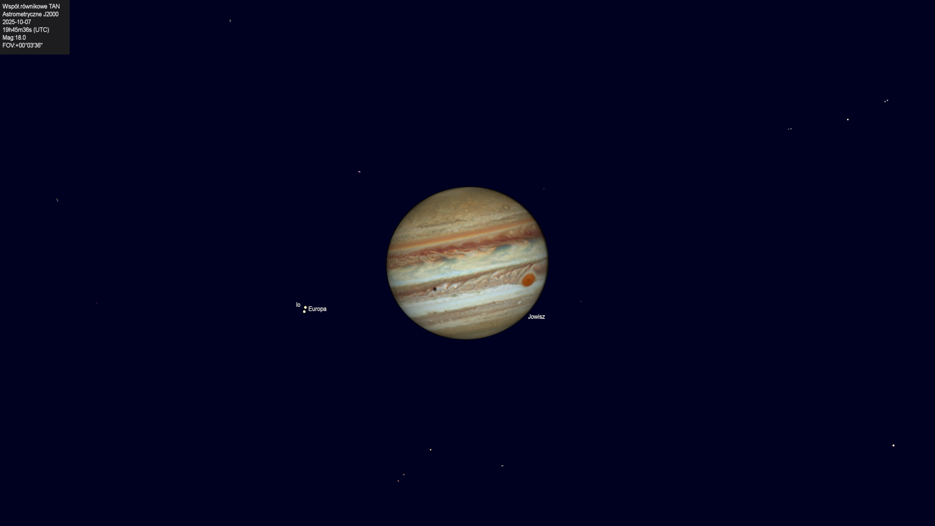 Koniec przejścia cienia księżyca Io na tle tarczy planety.