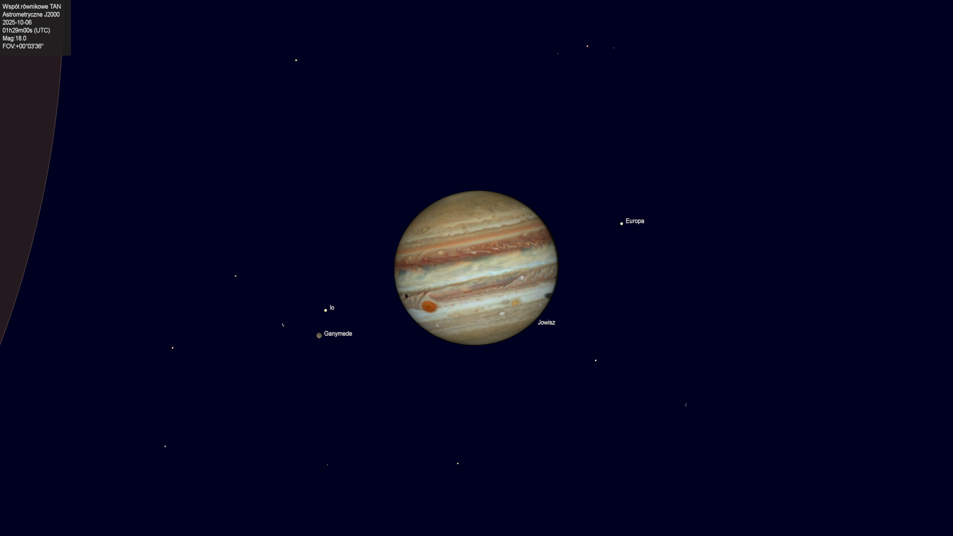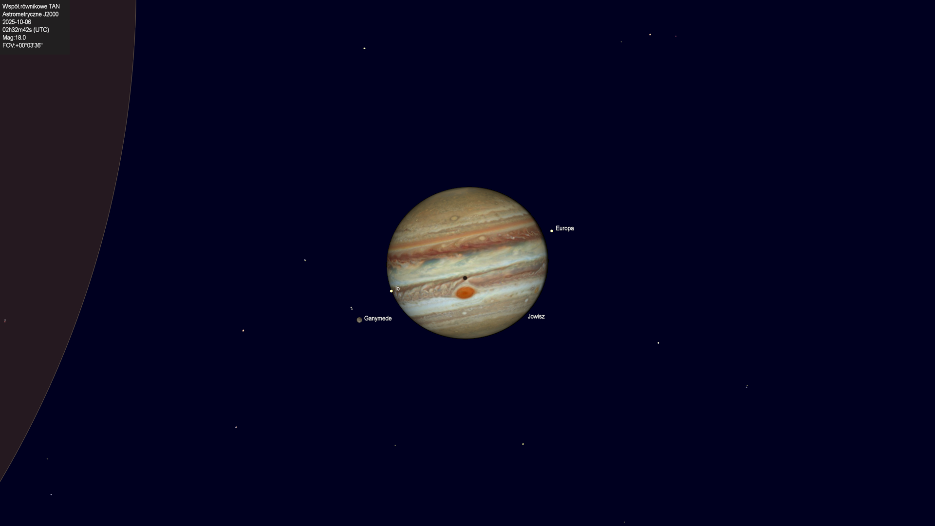 Początek przejścia cienia księżyca Europy na tle tle tarczy planety.