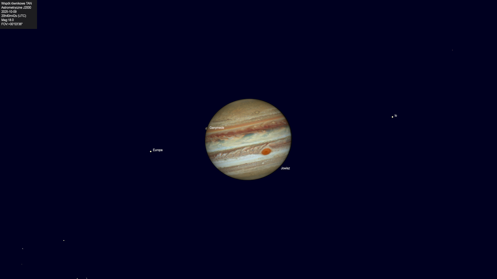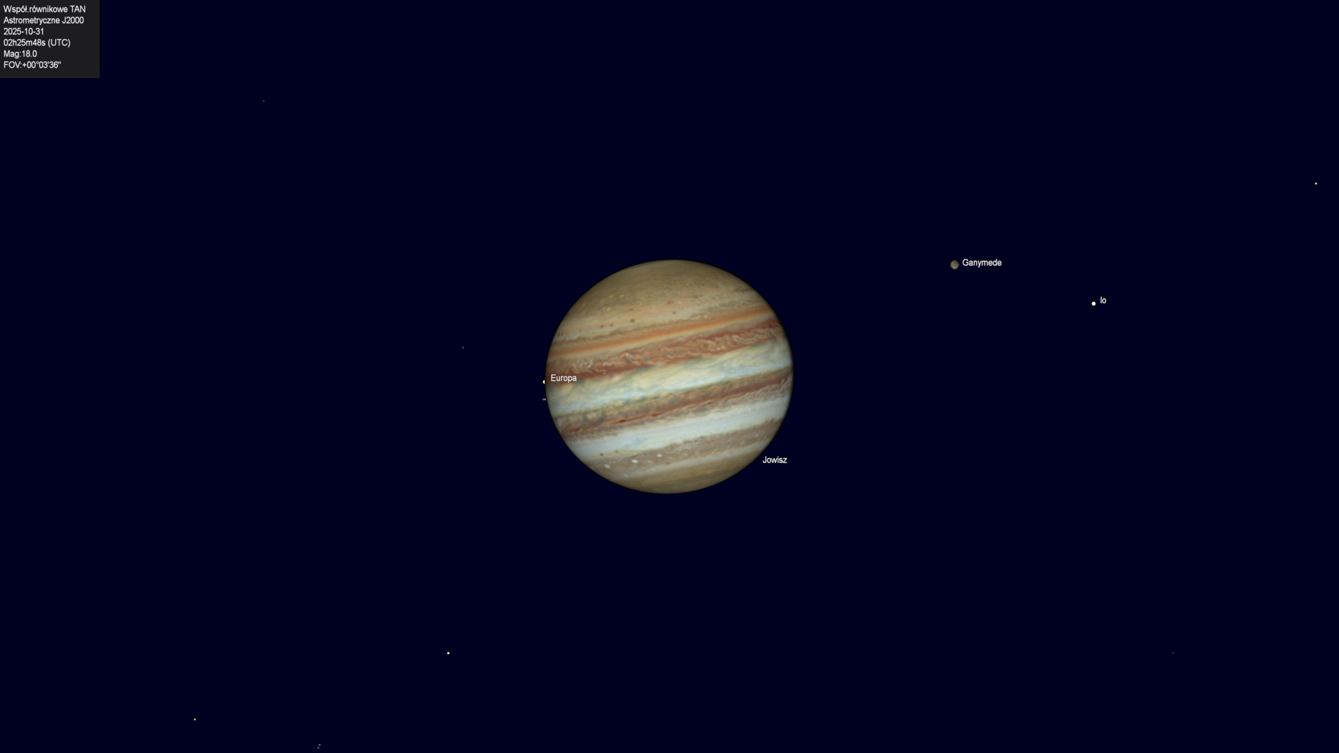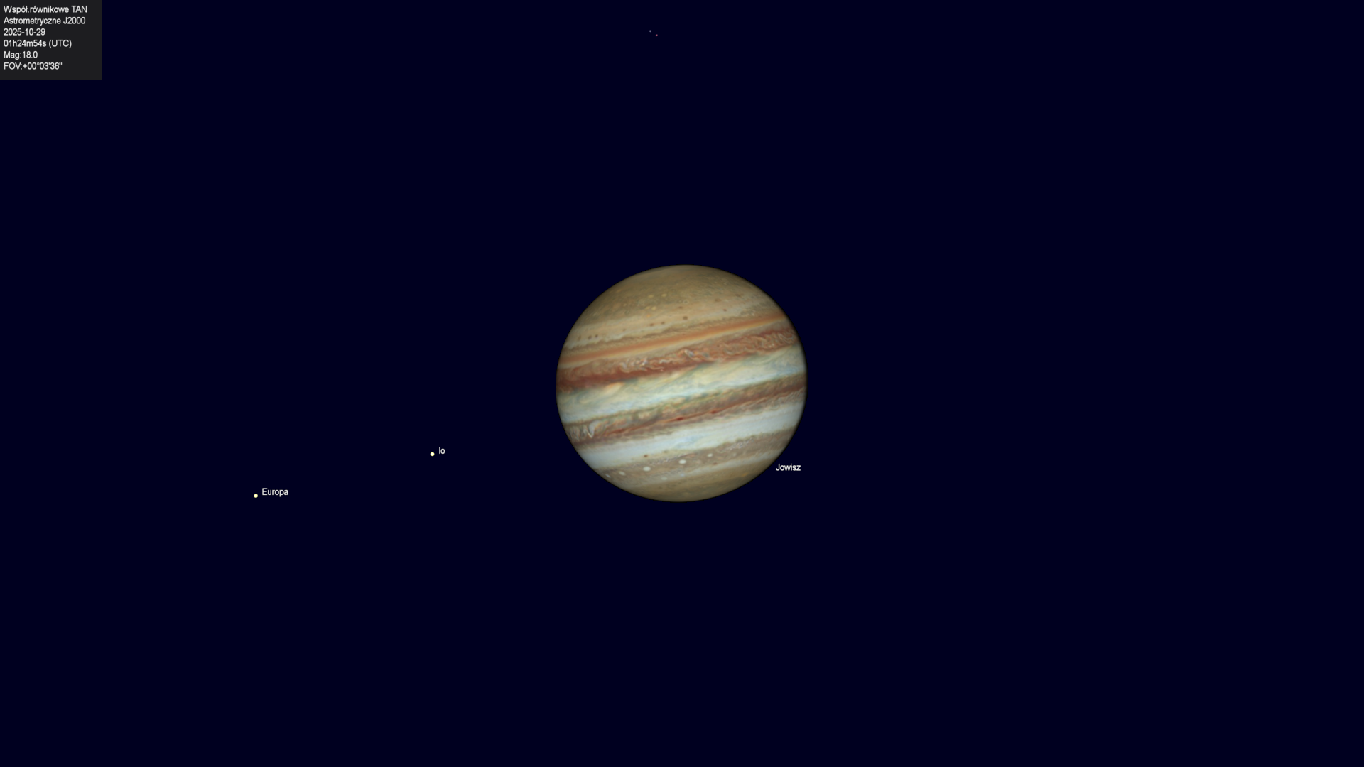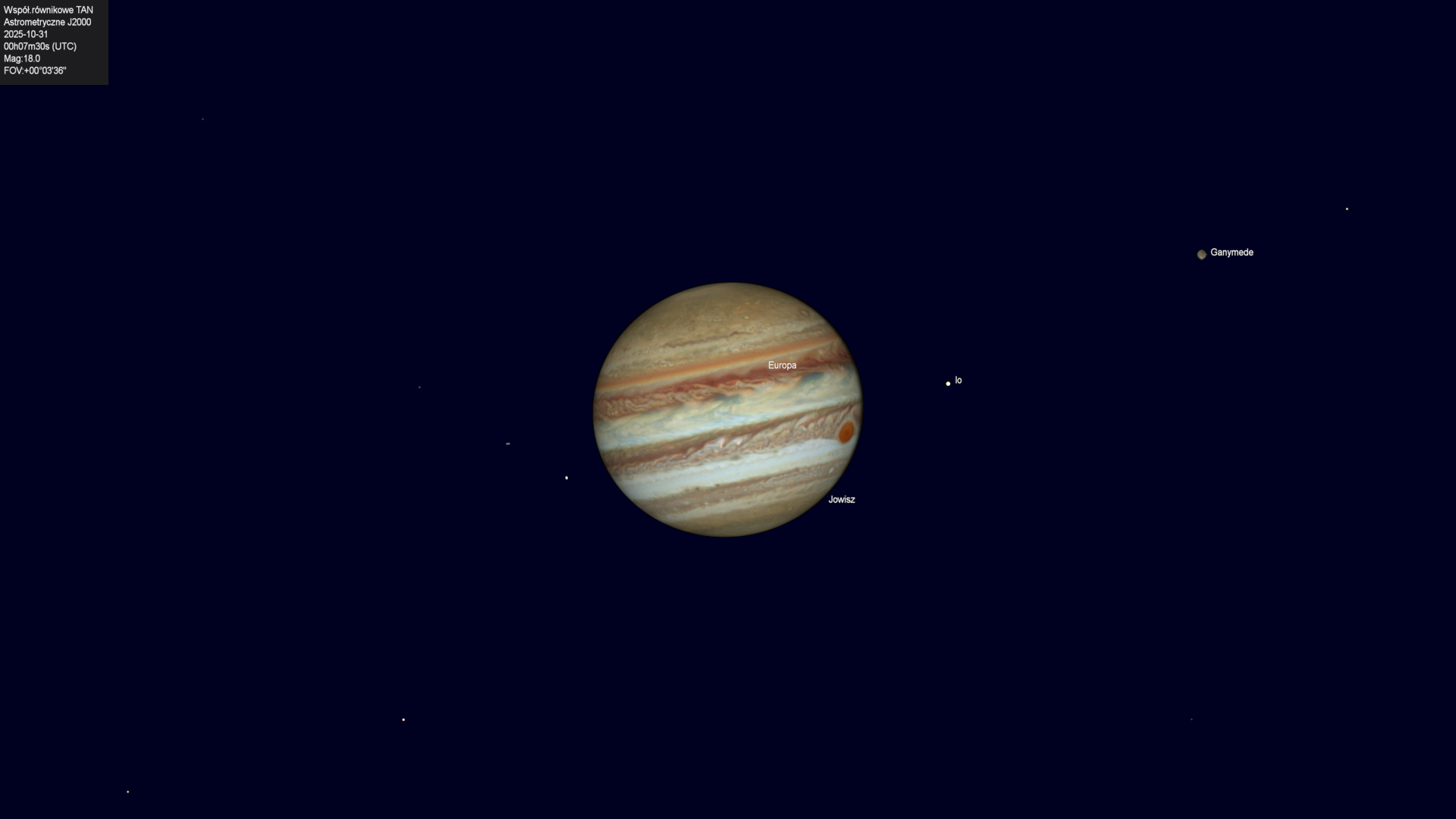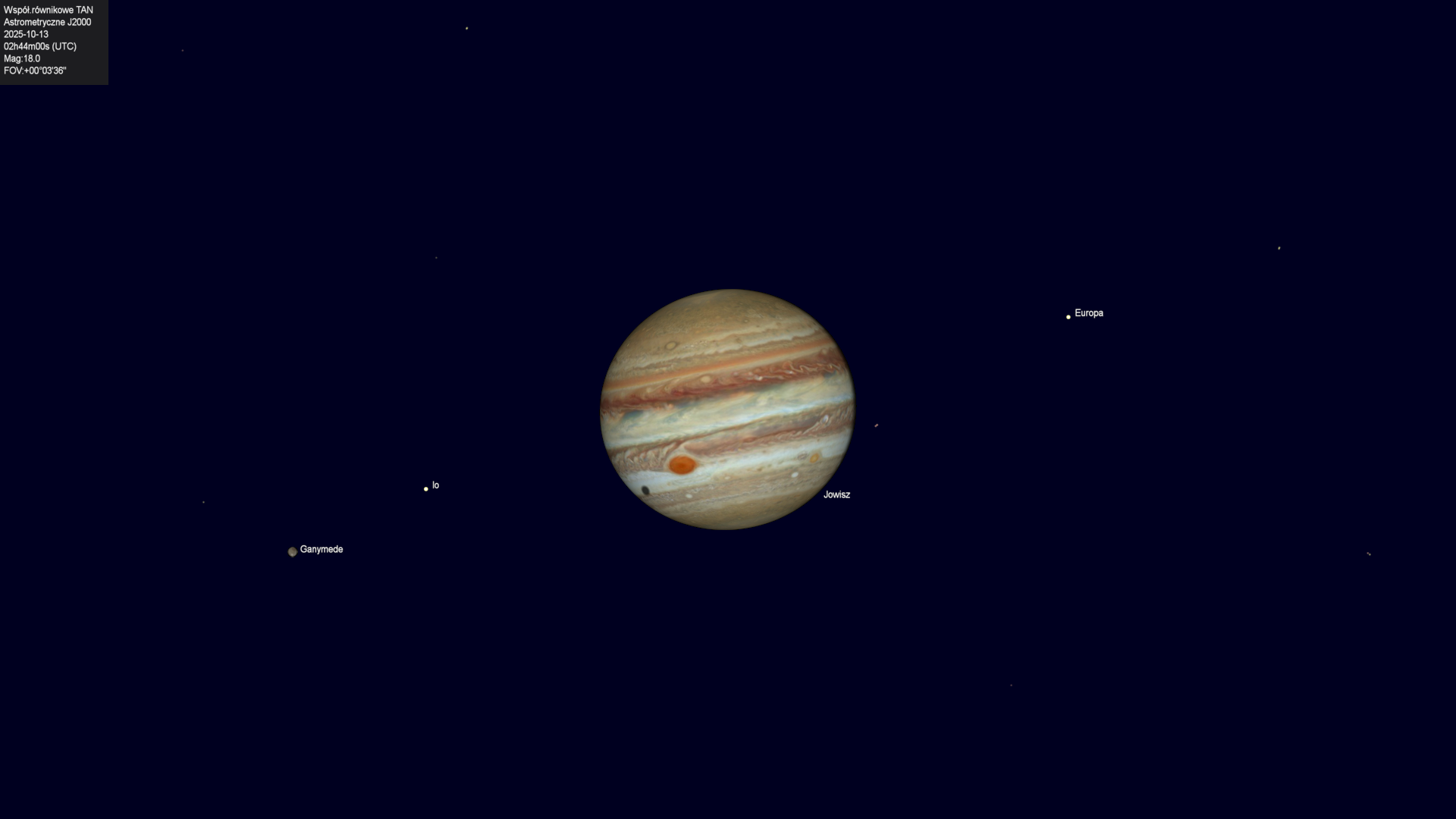 Koniec przejścia cienia księżyca Europy na tle tarczy planety.
