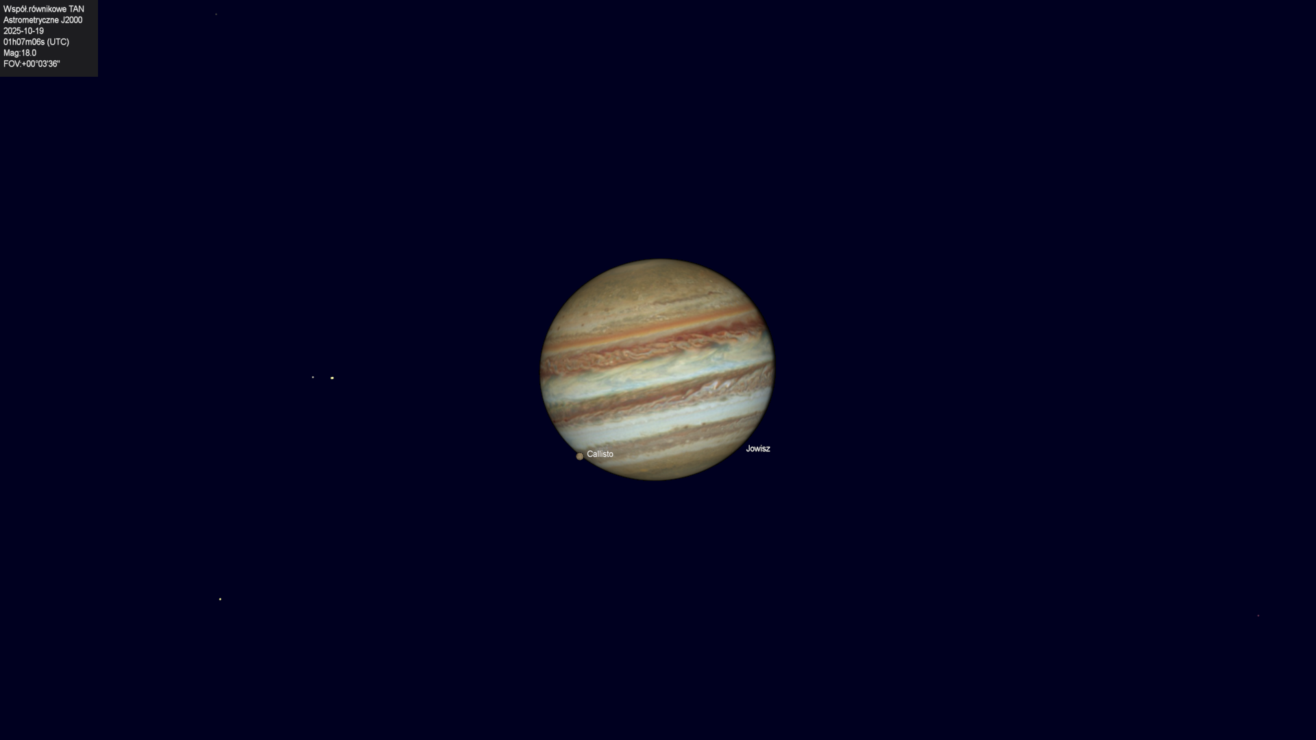 Początek przejścia księżyca Kalisto na tle tarczy planety.