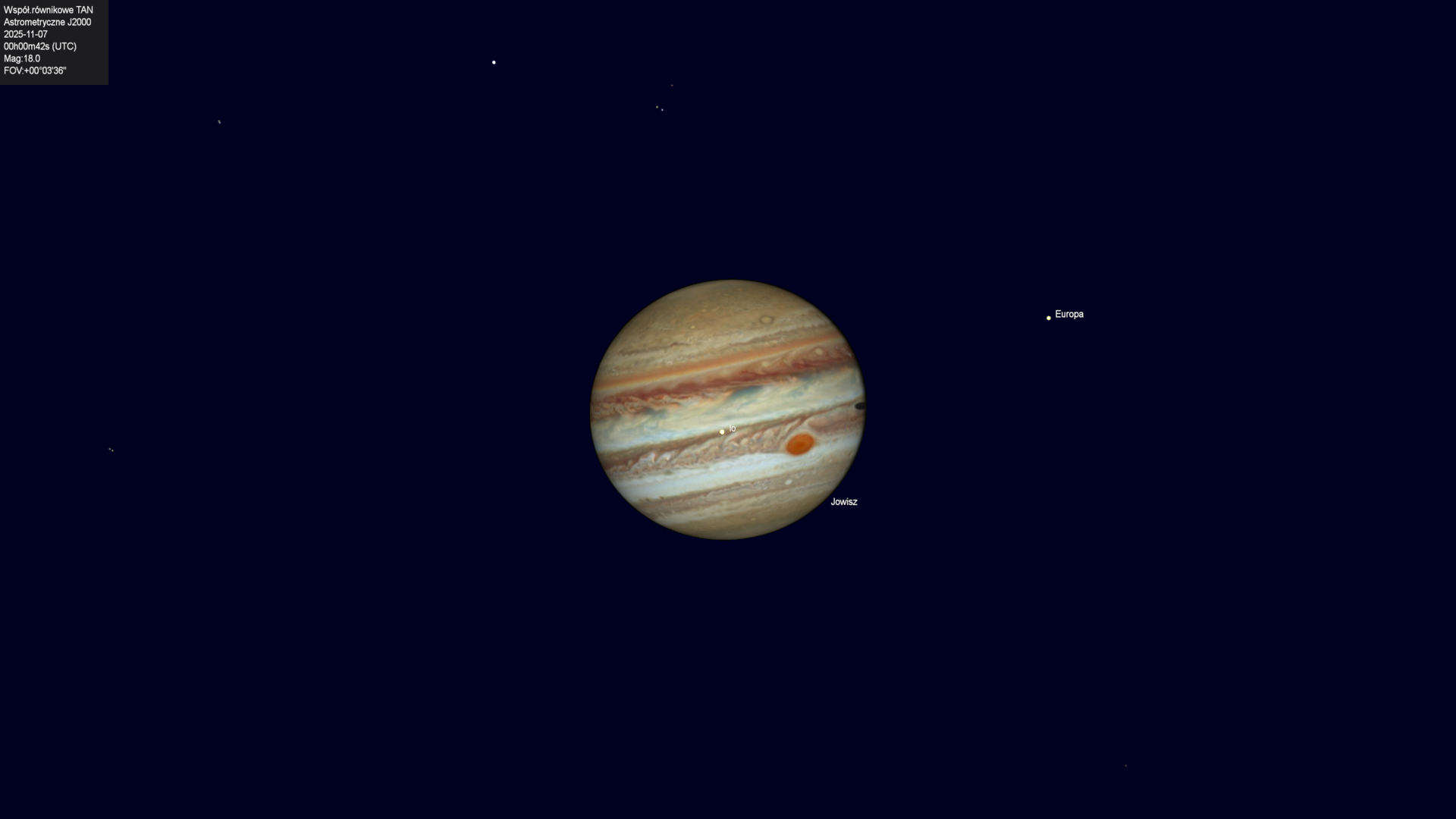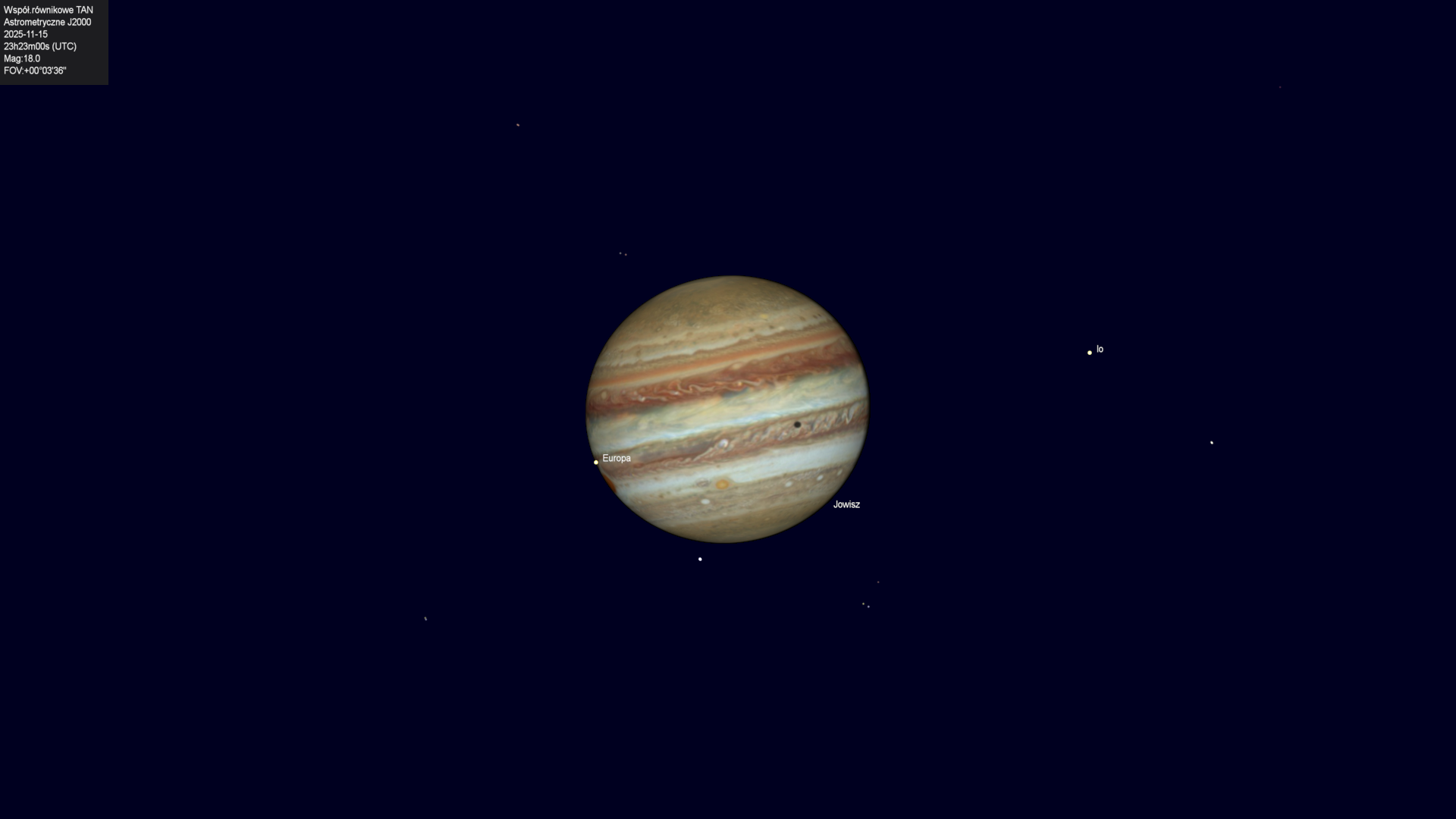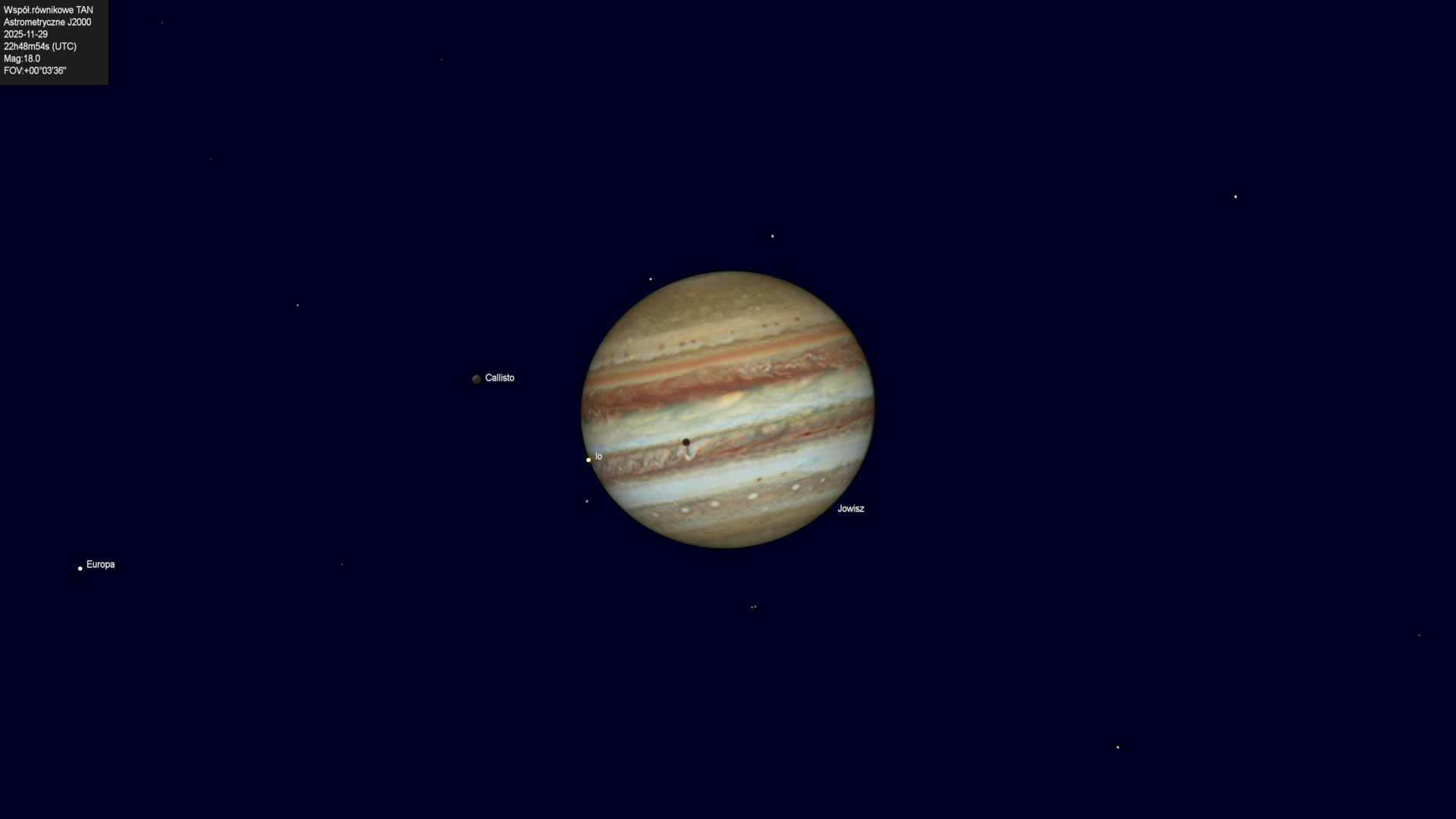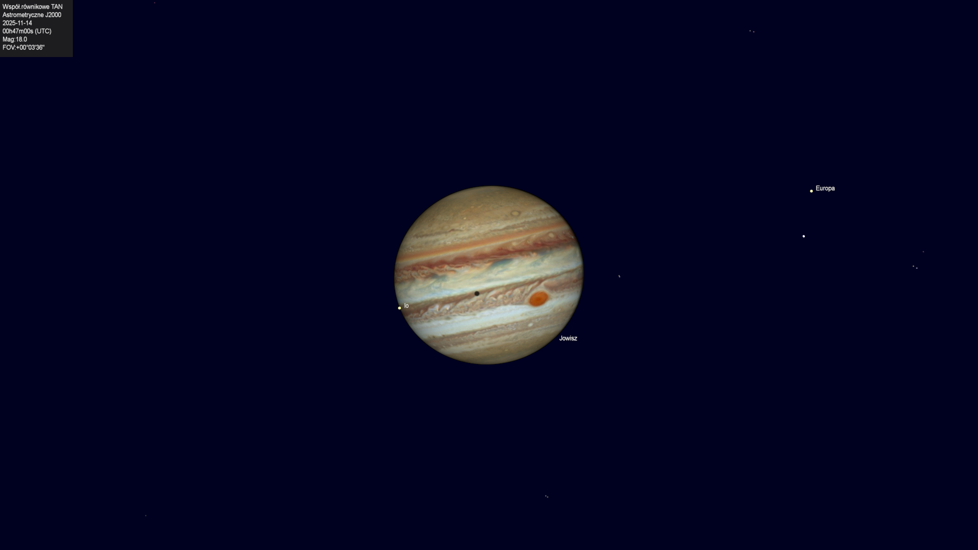 Początek przejścia cienia księżyca Io na tle tarczy planety.