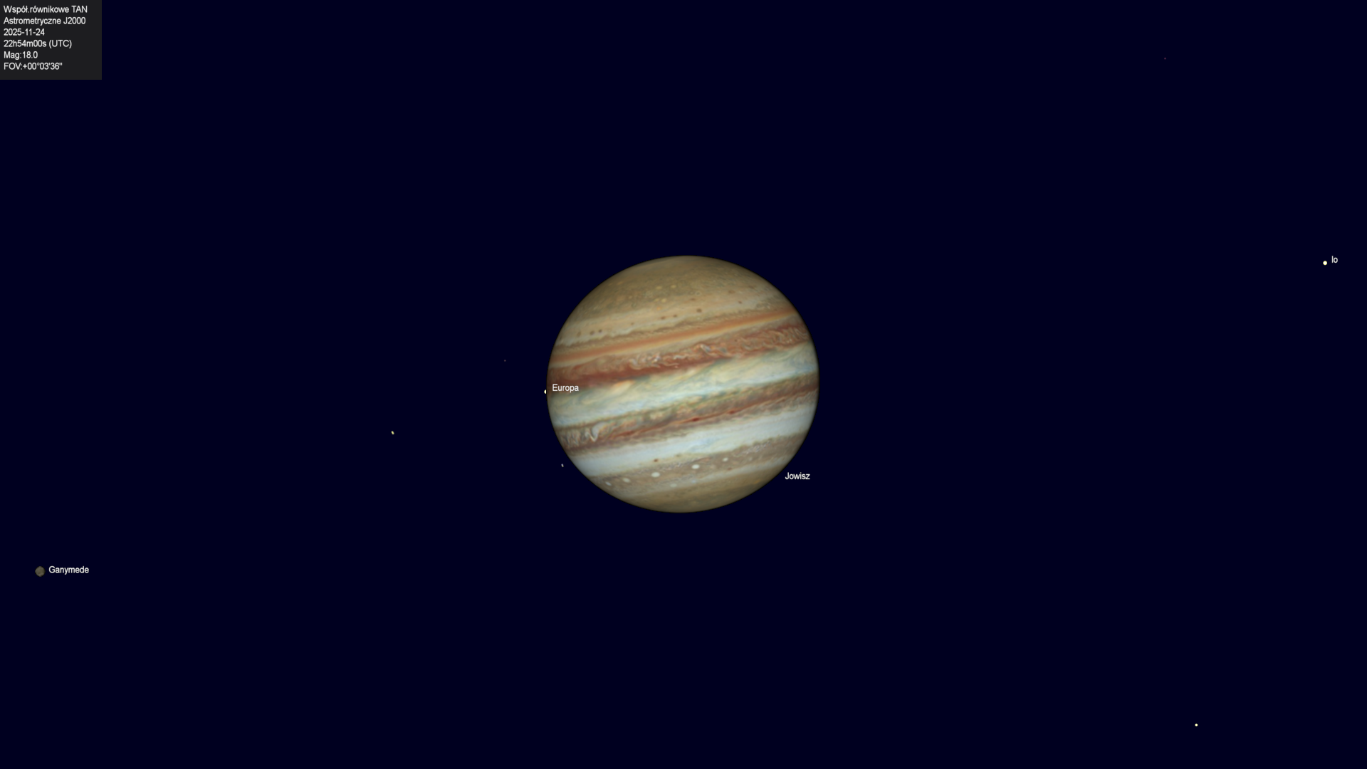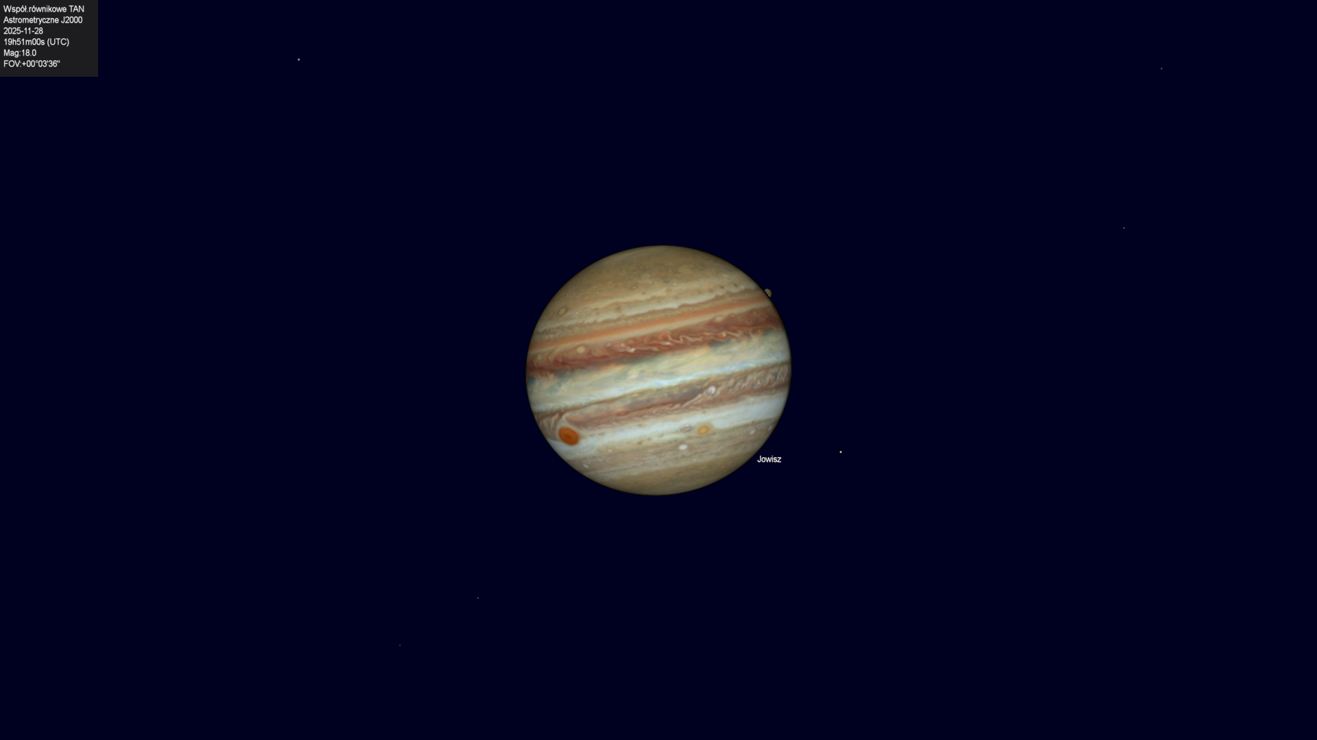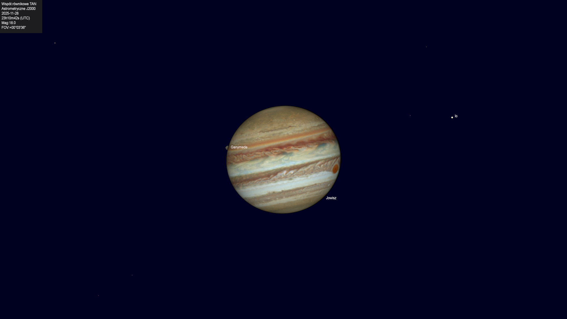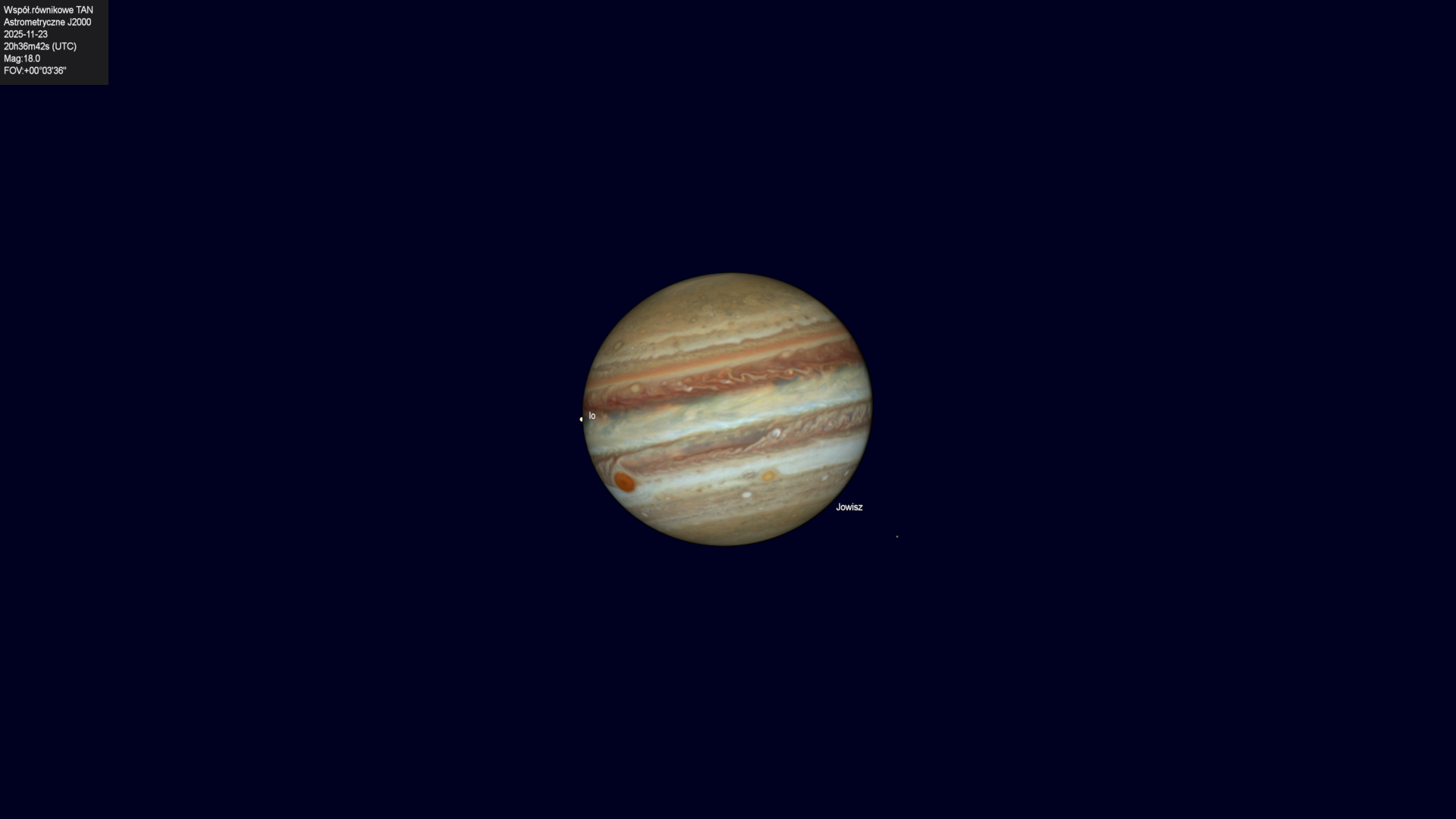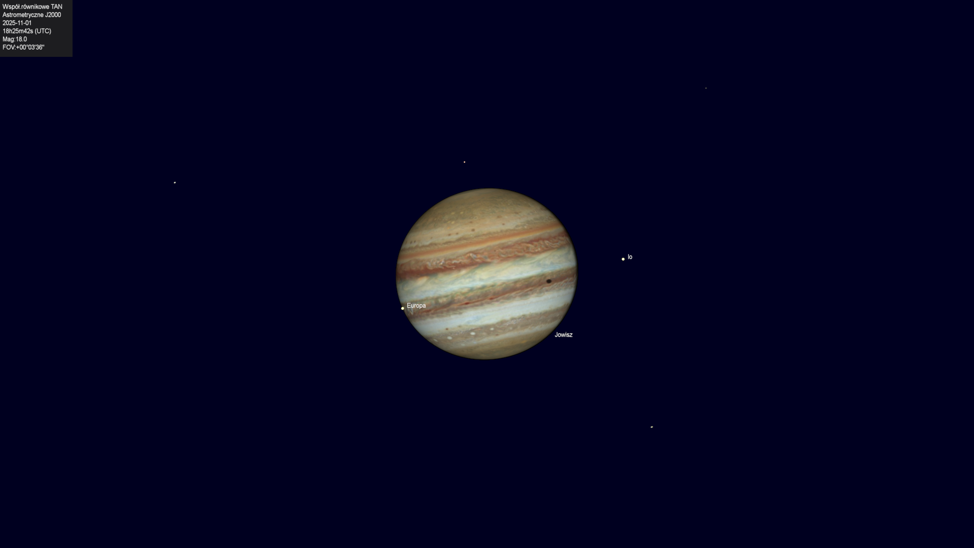Początek przejścia cienia księżyca Io na tle tarczy planety.