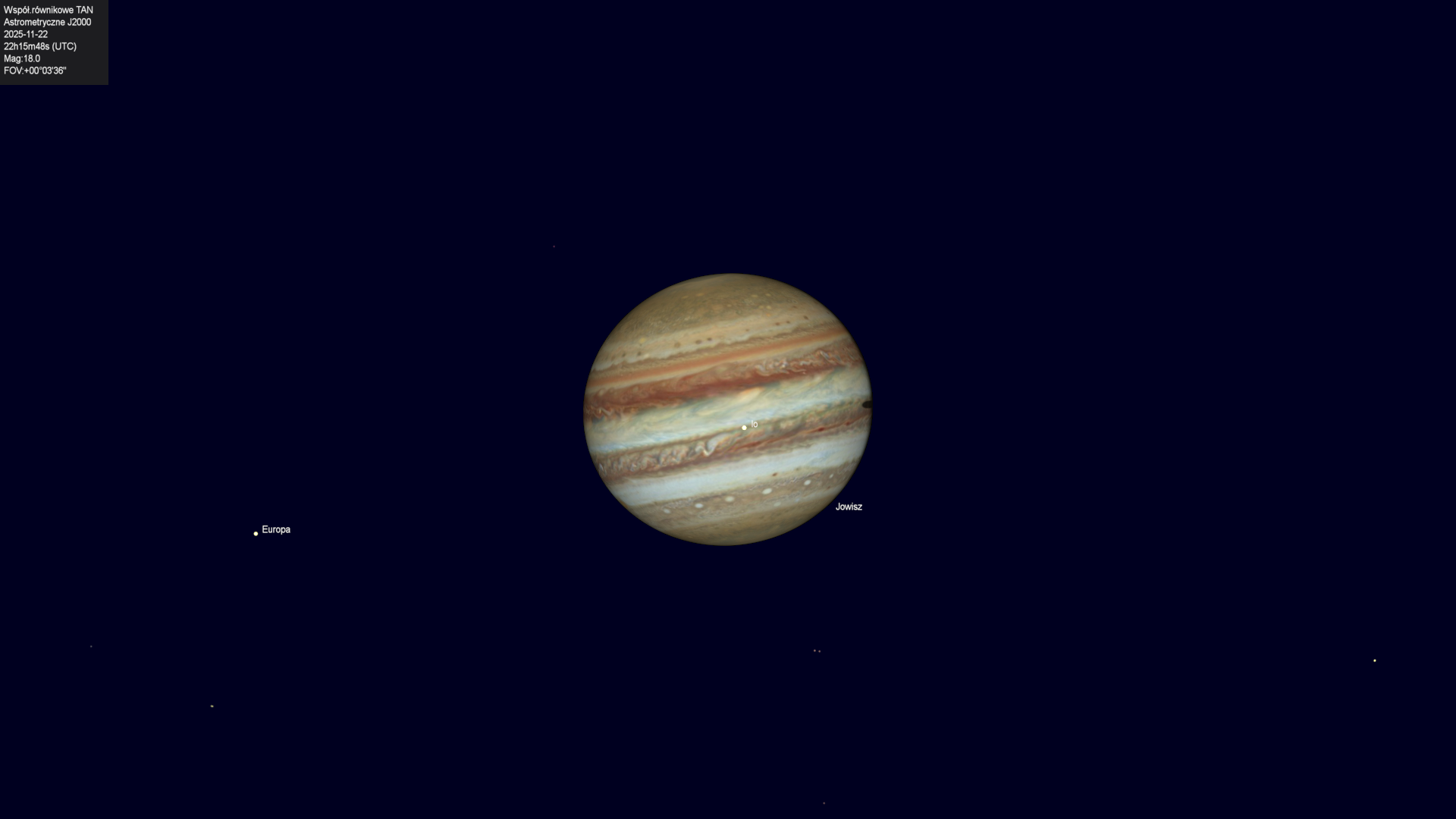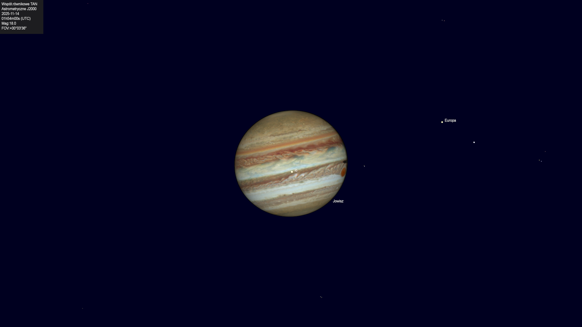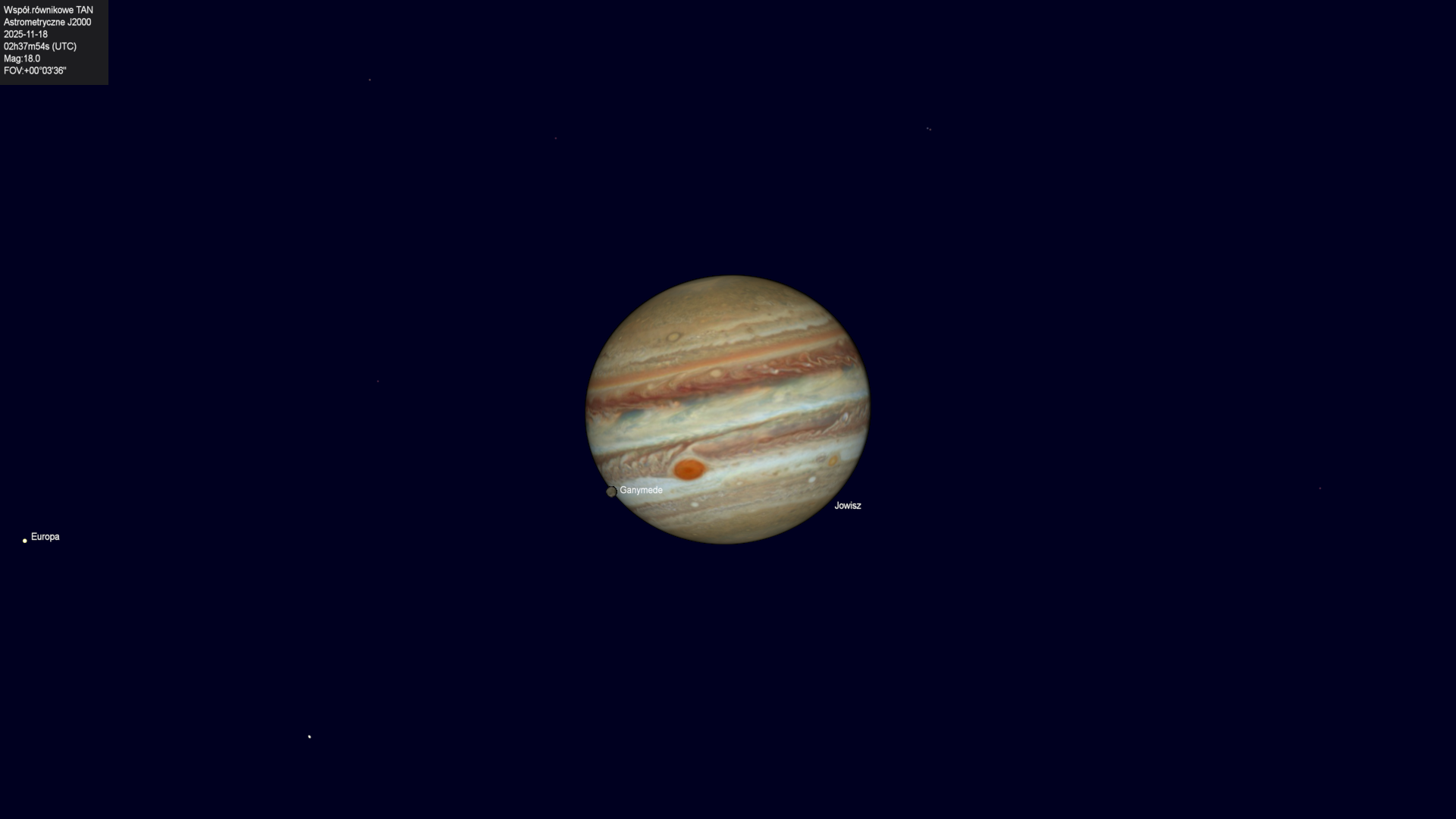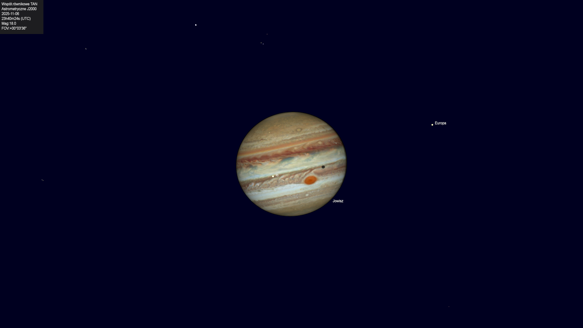 Początek zaćmienia księżyca Europy przez cień planety.