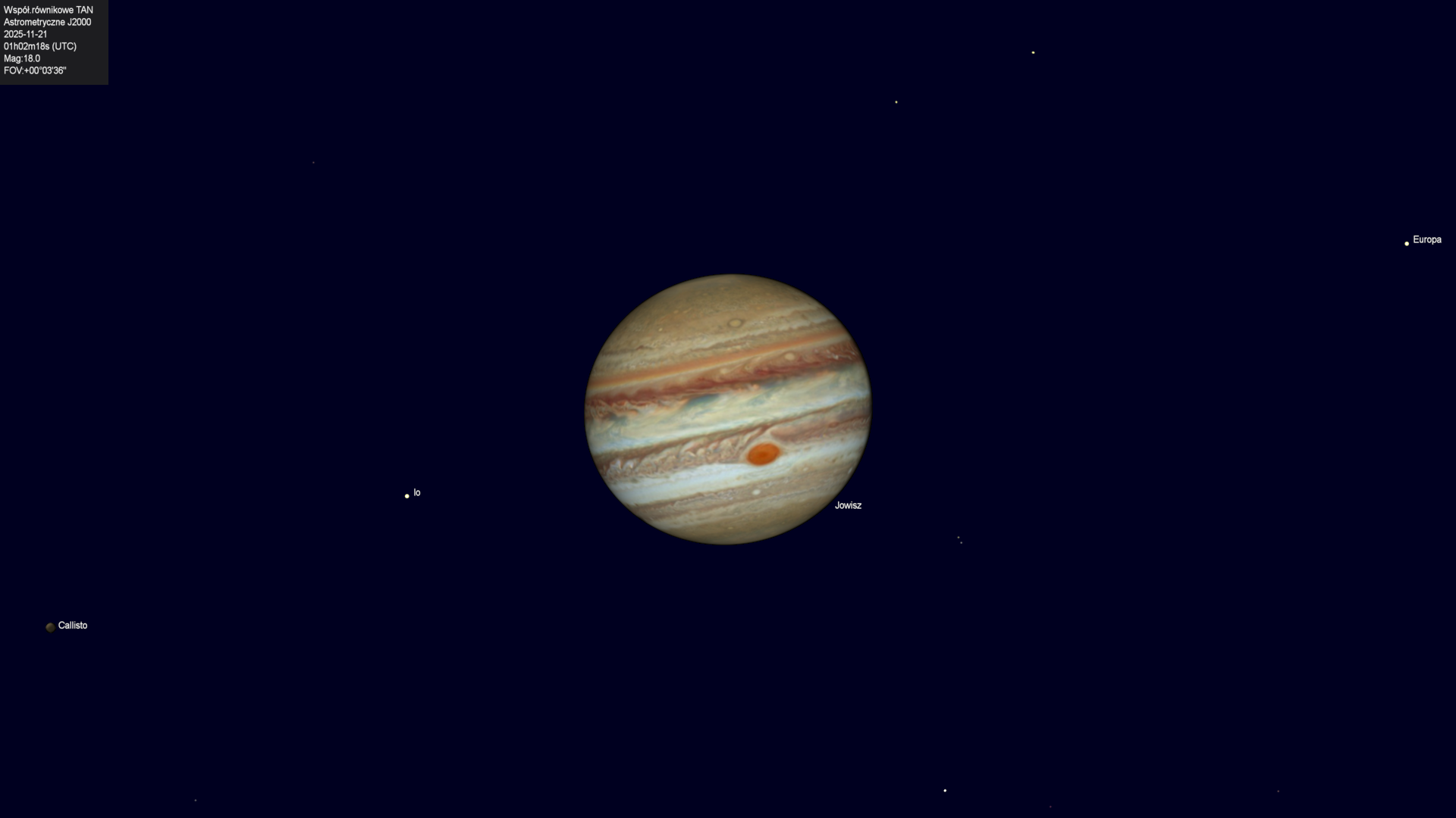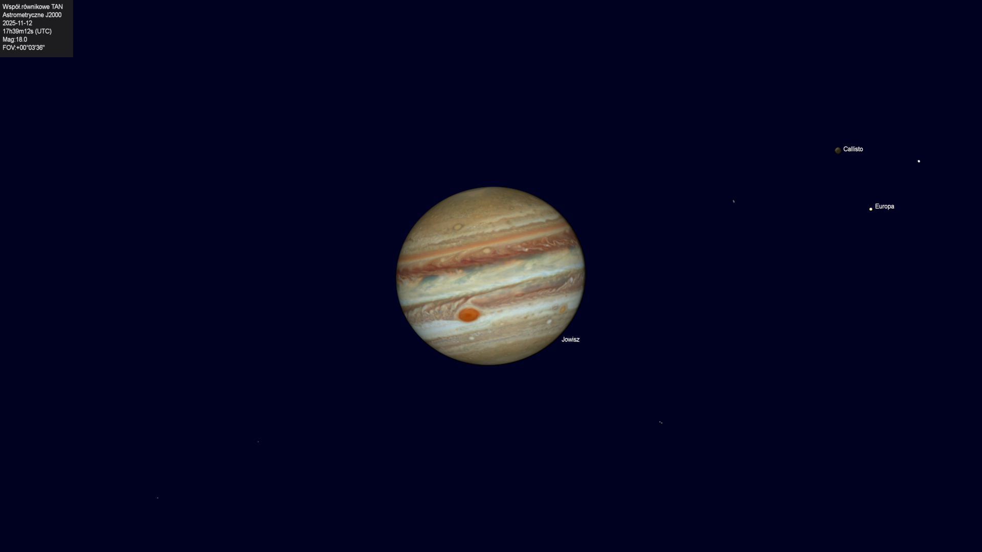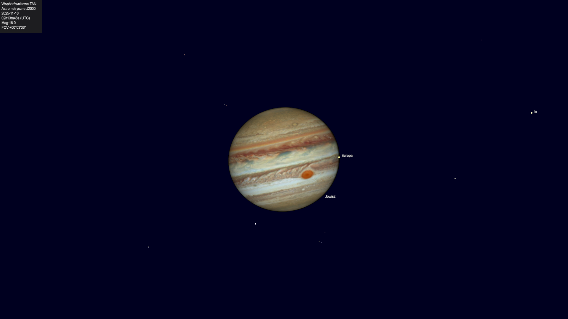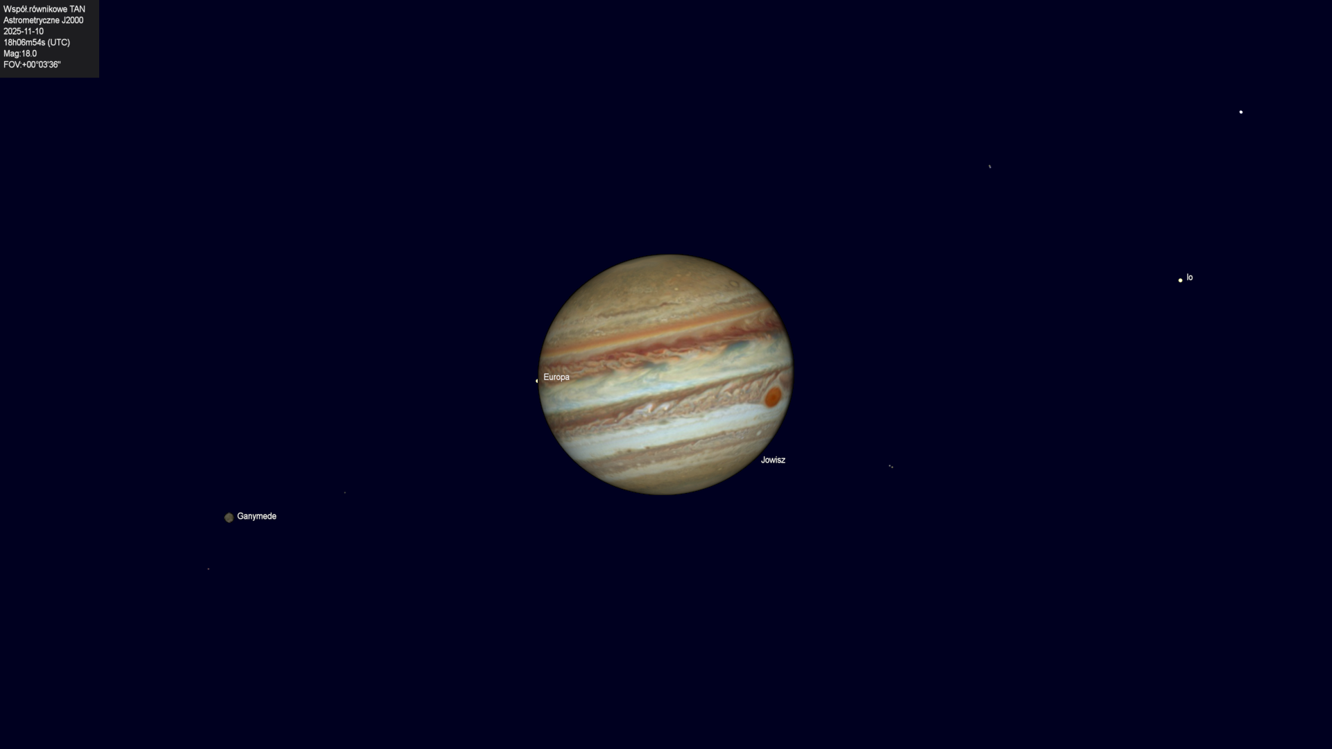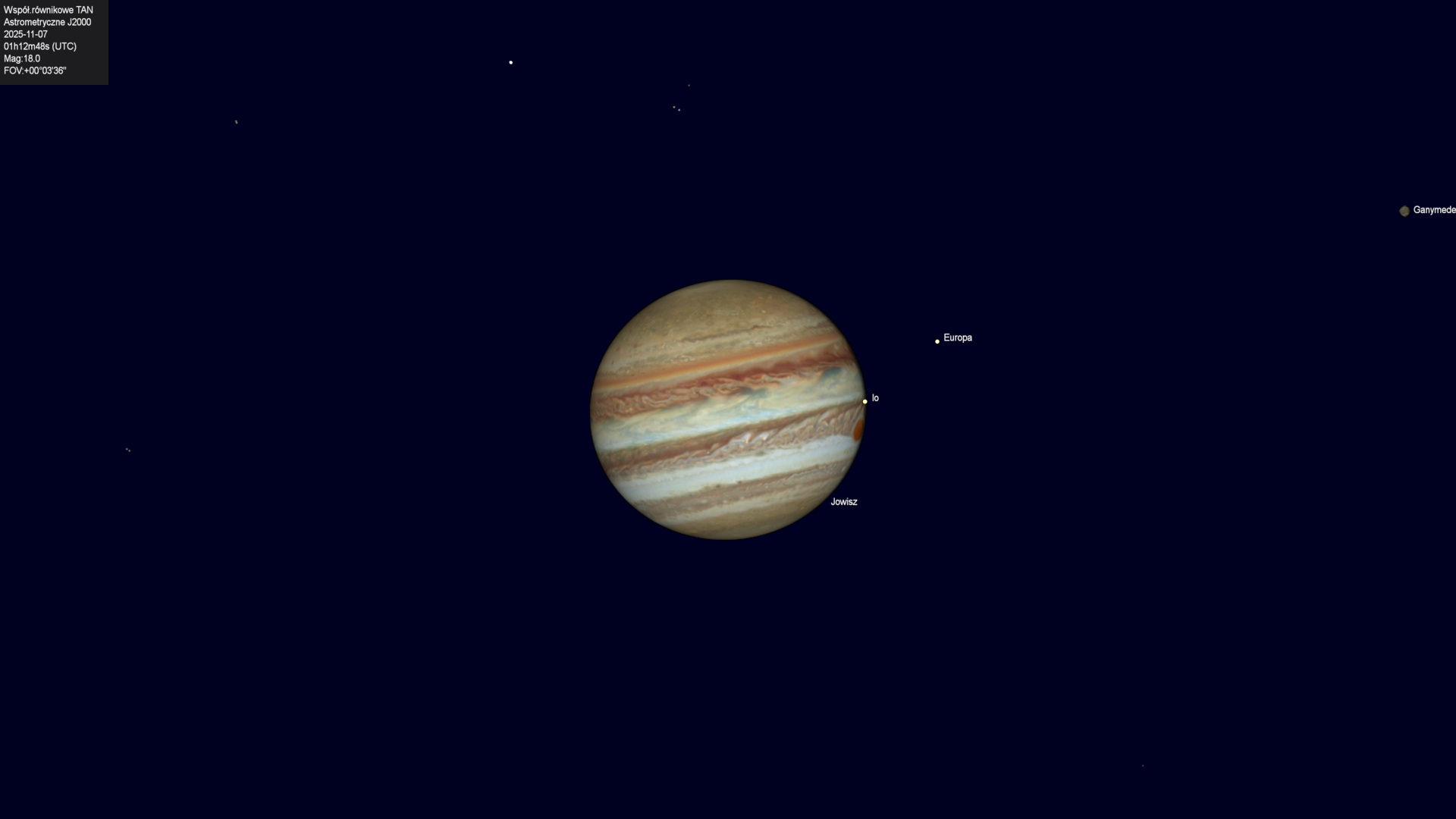 Początek zaćmienia księżyca Europy przez cień planety.