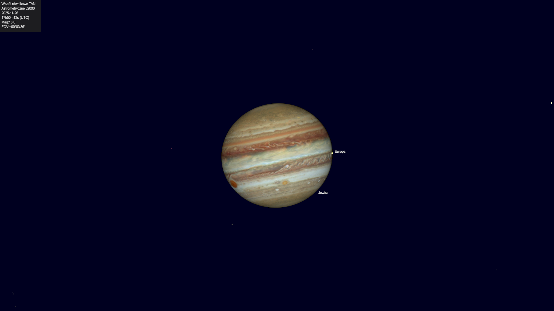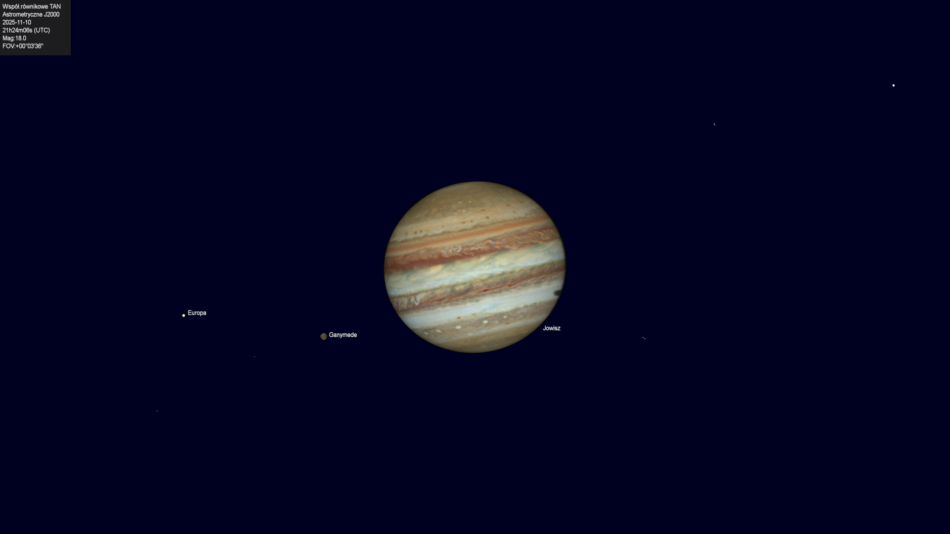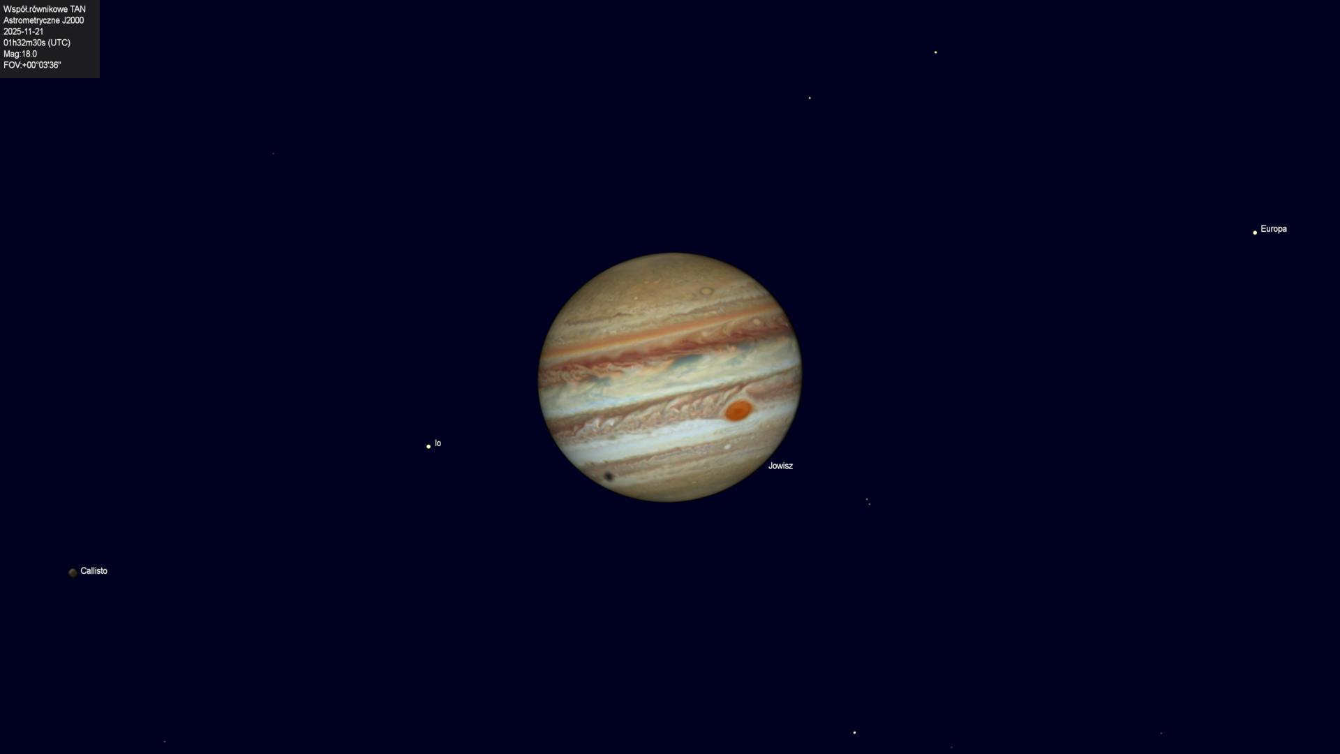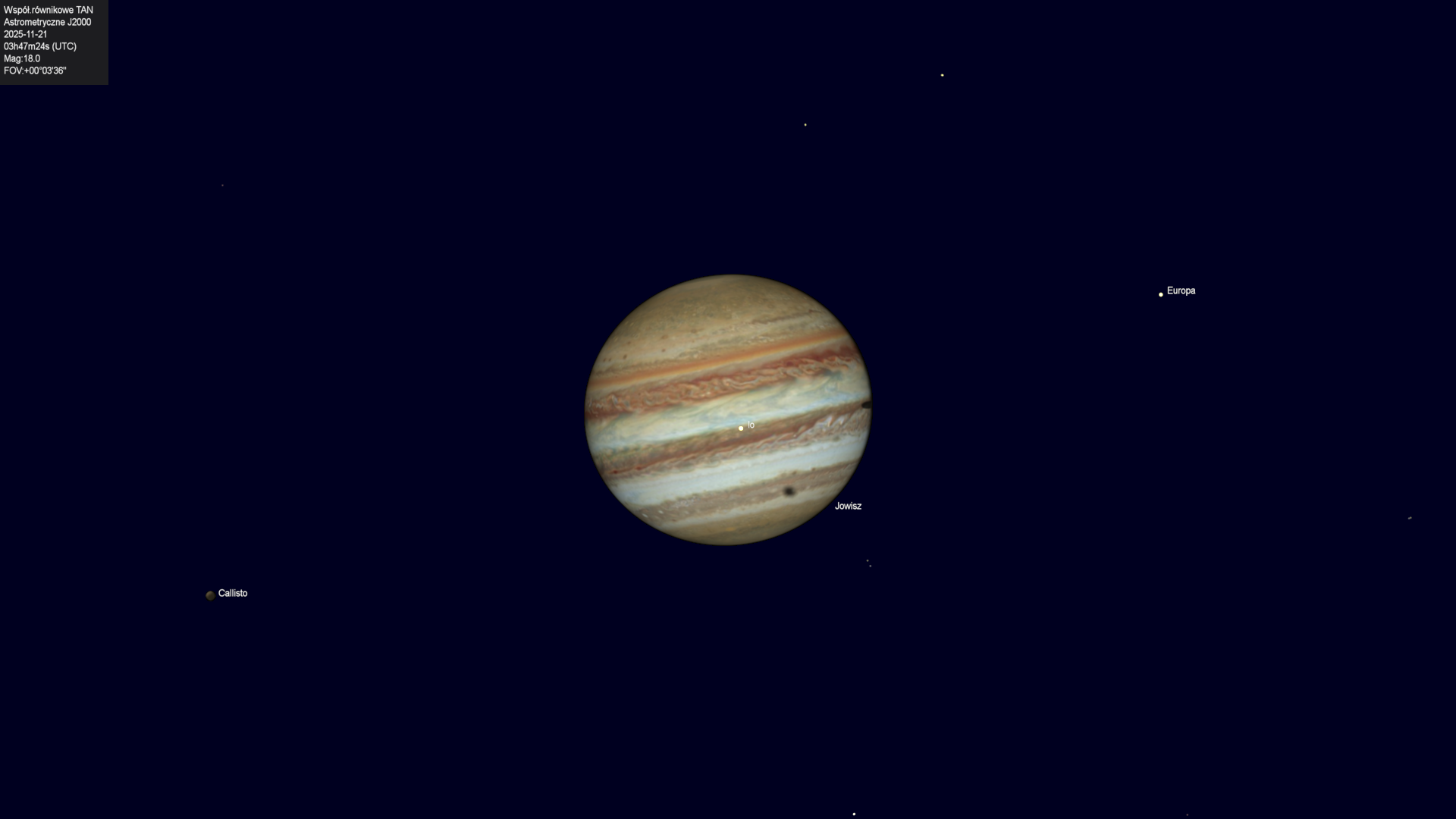 Koniec przejścia cienia księżyca Europy na tle tarczy planety.