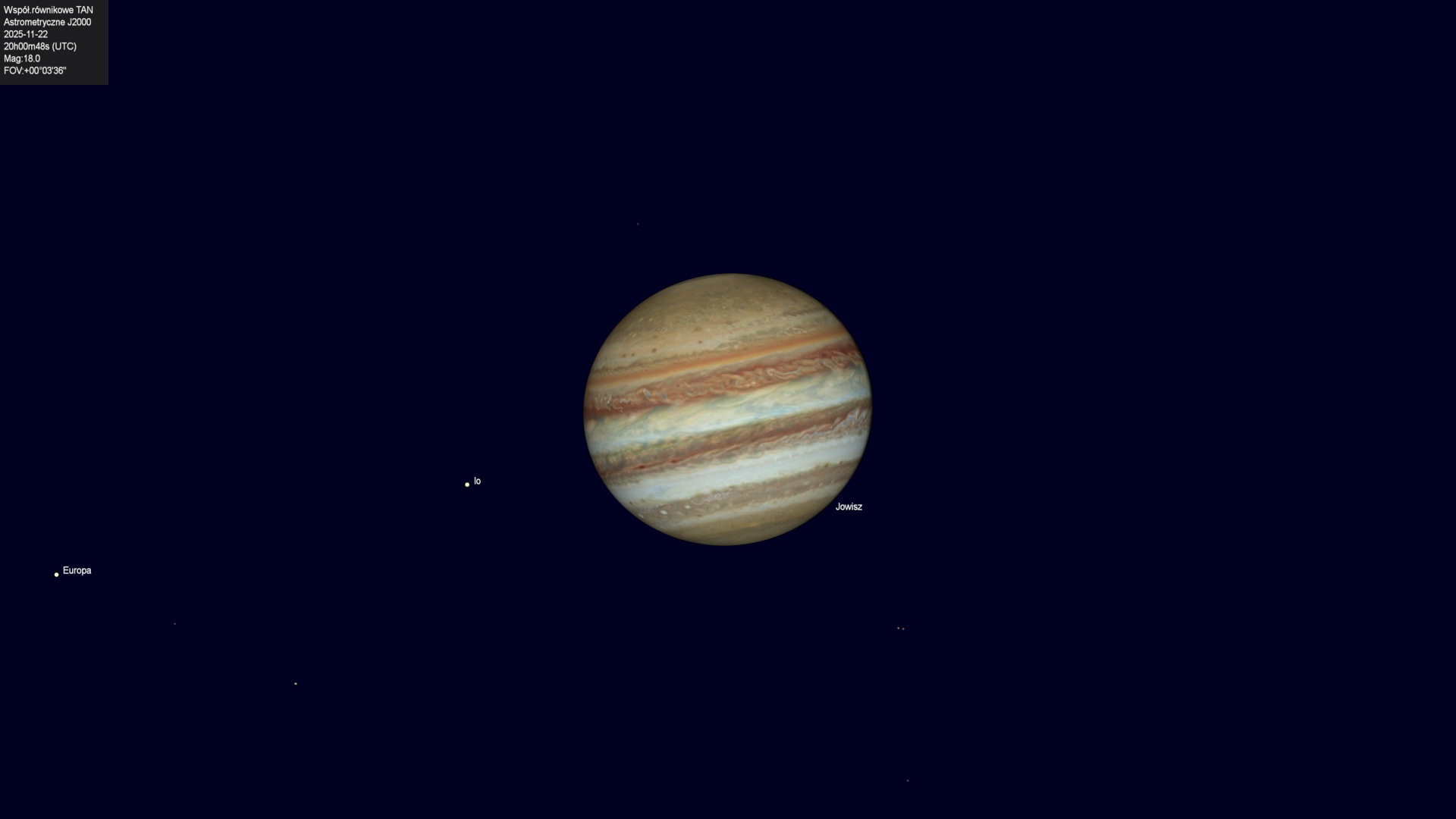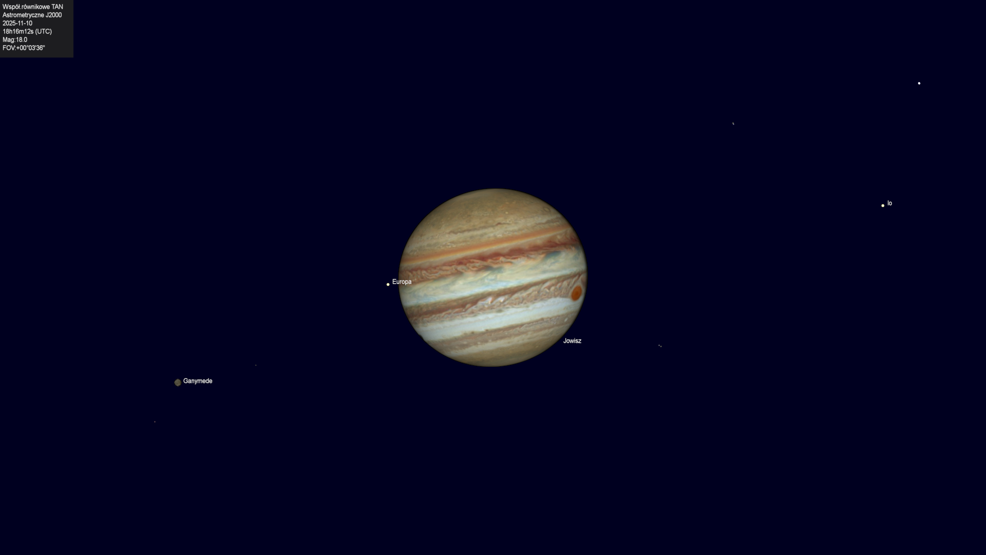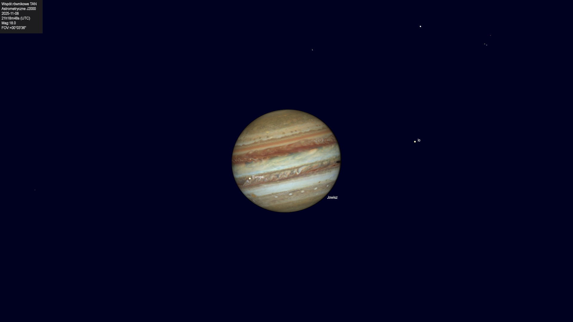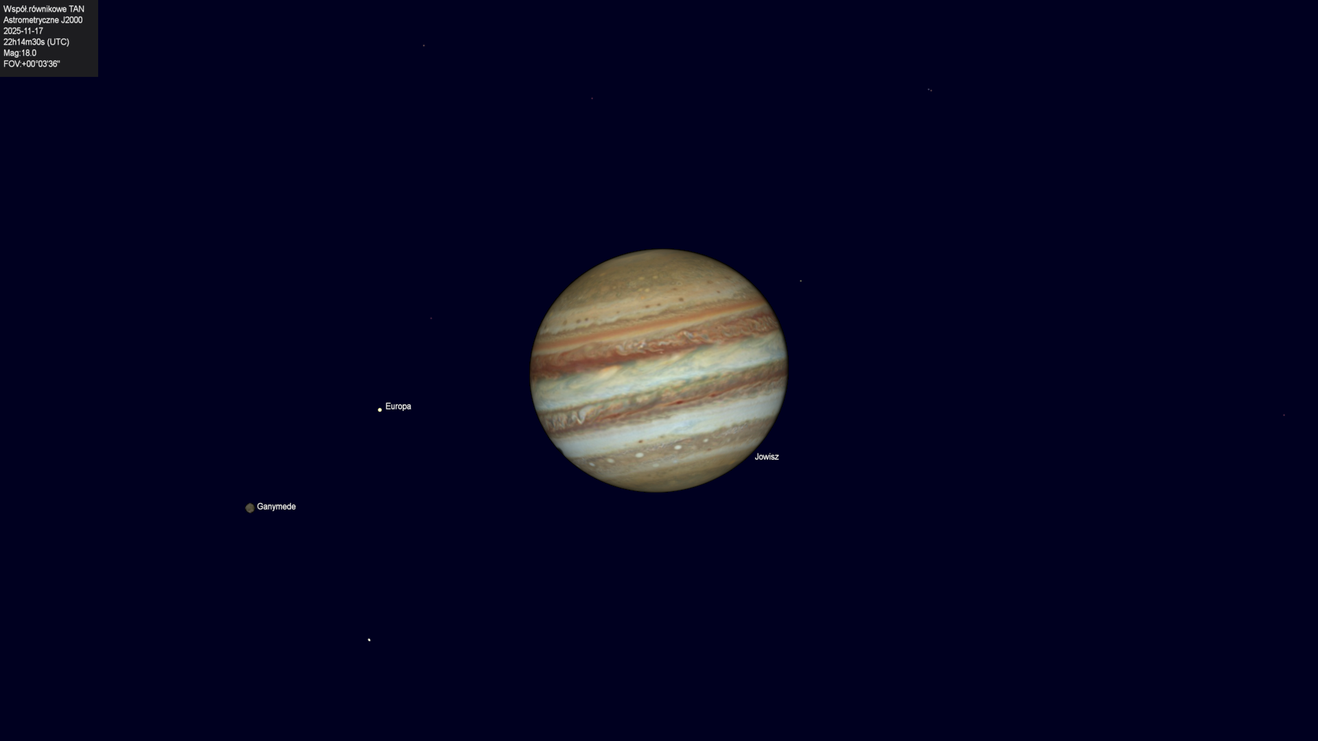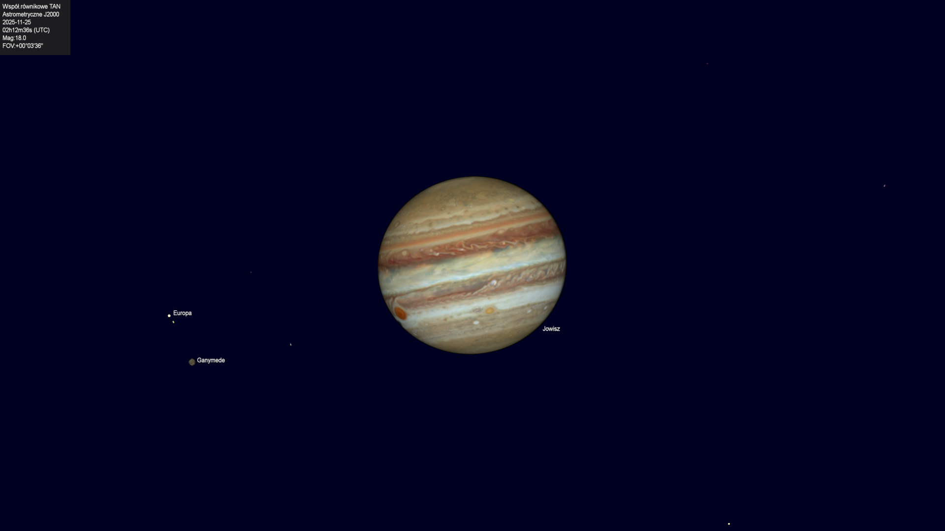 Koniec przejścia cienia księżyca Europy na tle tarczy planety.