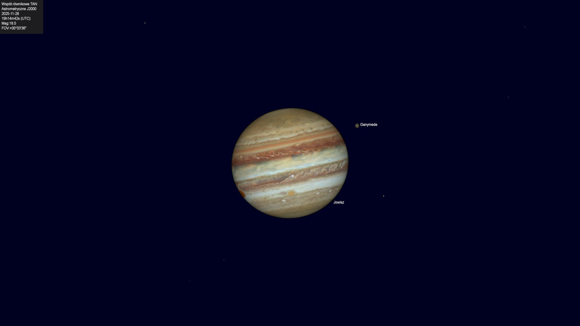 Początek przejścia cienia księżyca Gaminedesa na tle tarczy planety.