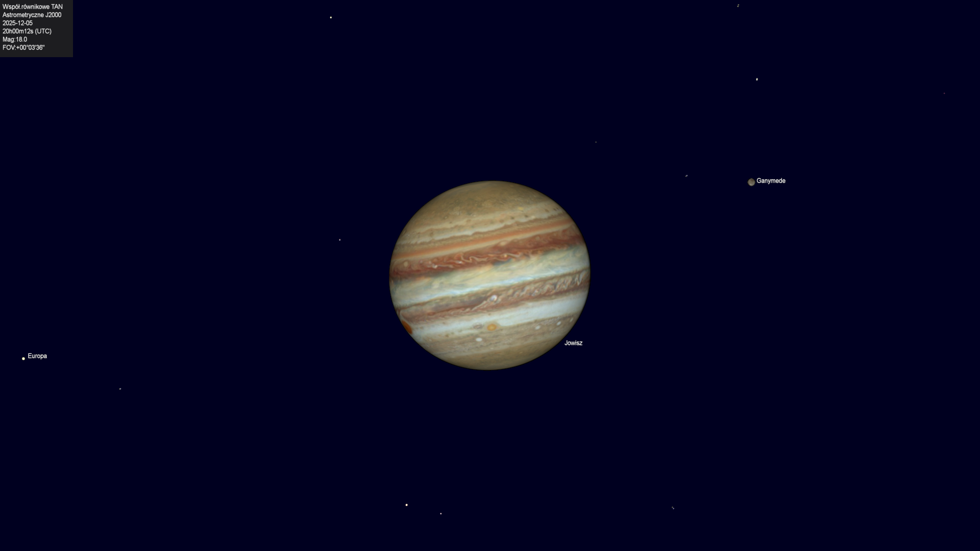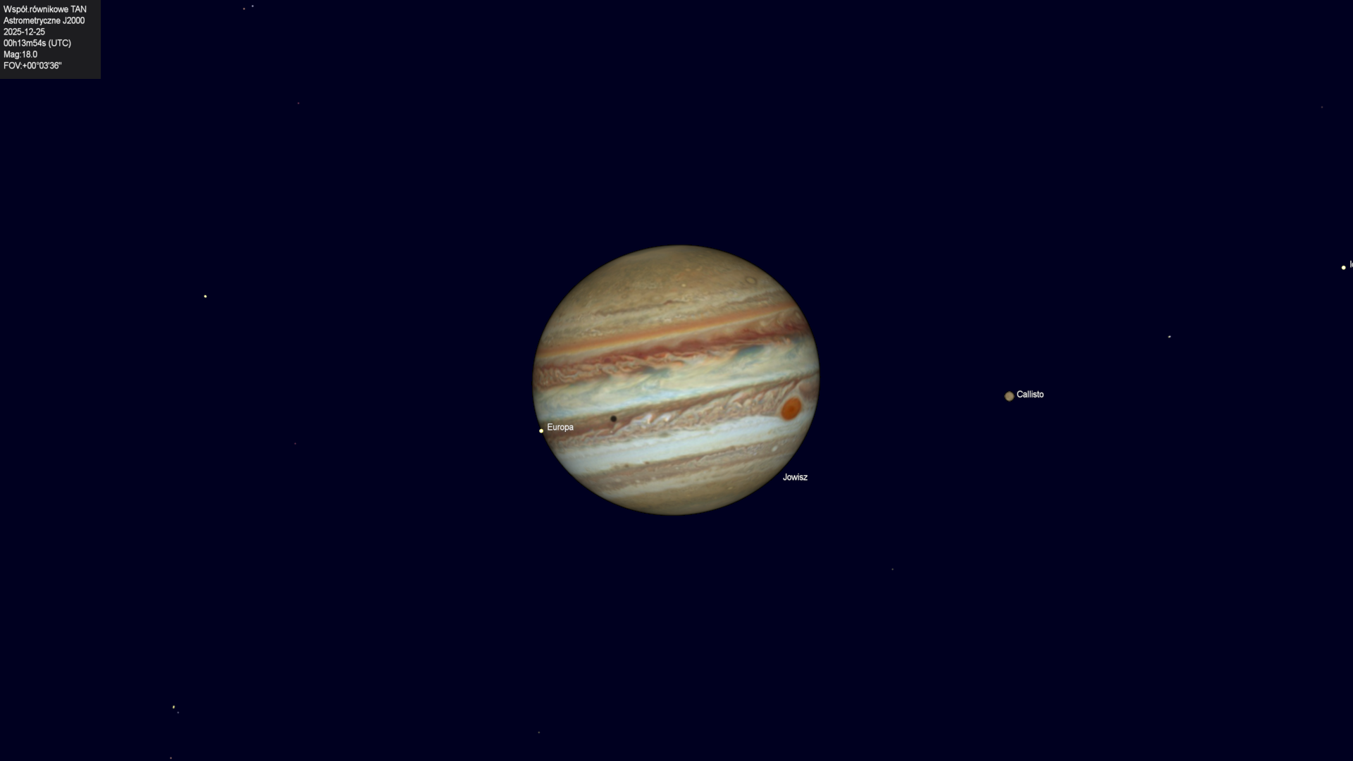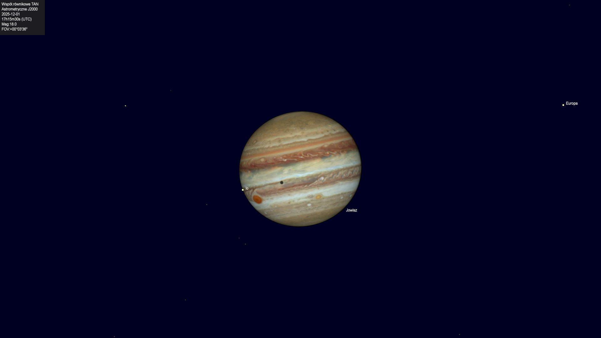 Koniec przejścia cienia księżyca Europy na tle tarczy planety.