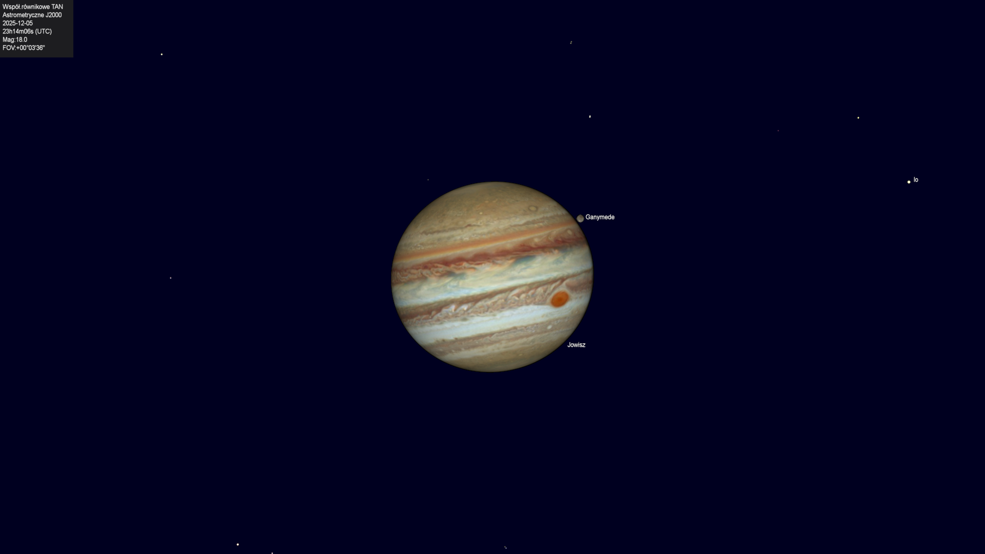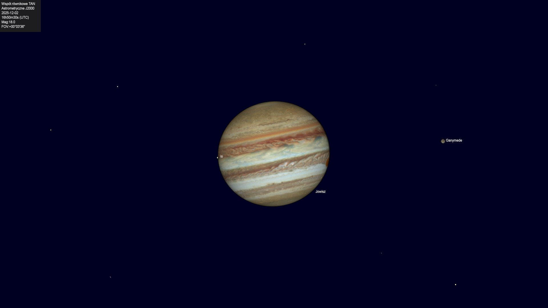 Początek przejścia cienia księżyca Gaminedesa na tle tarczy planety.