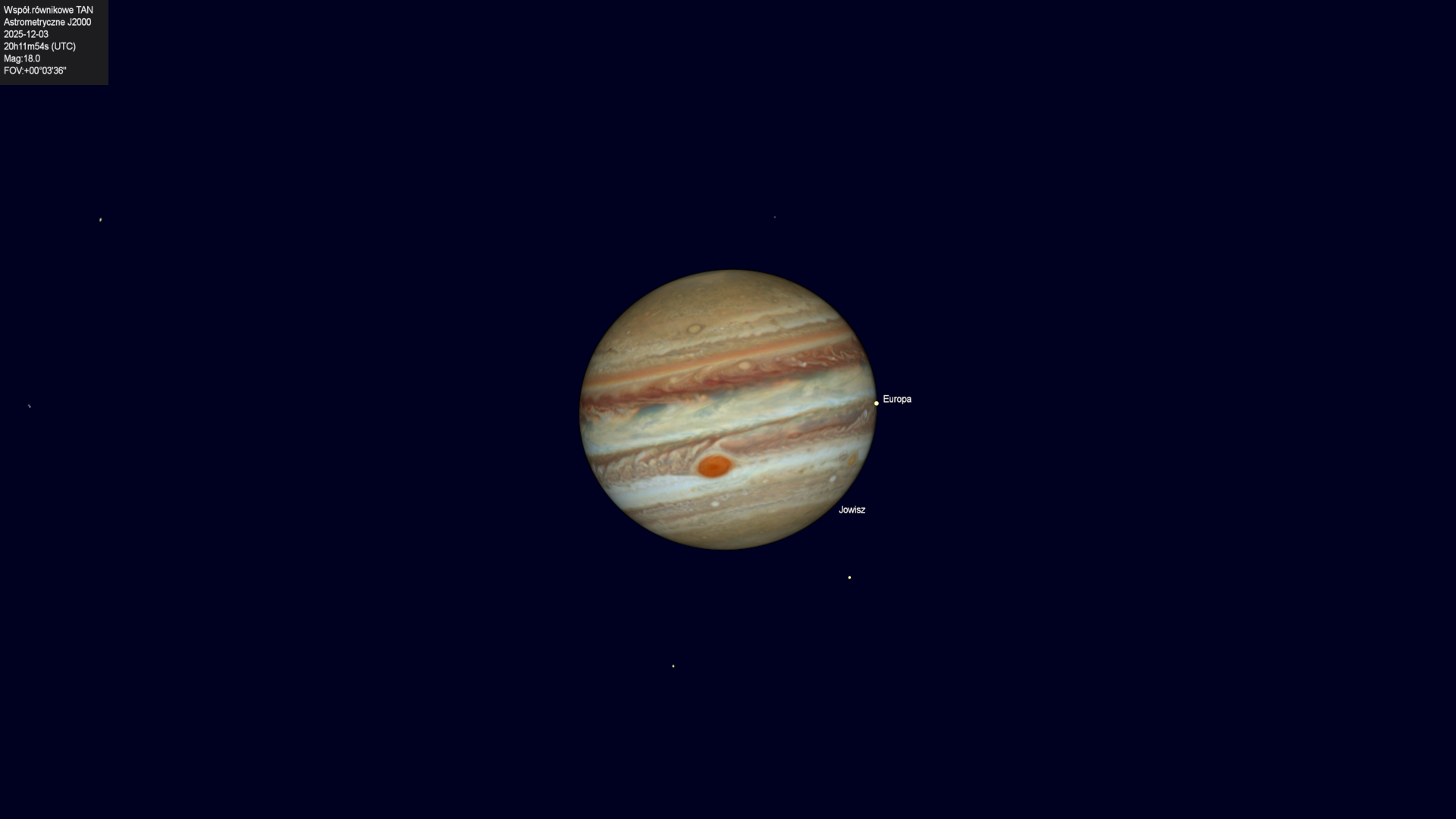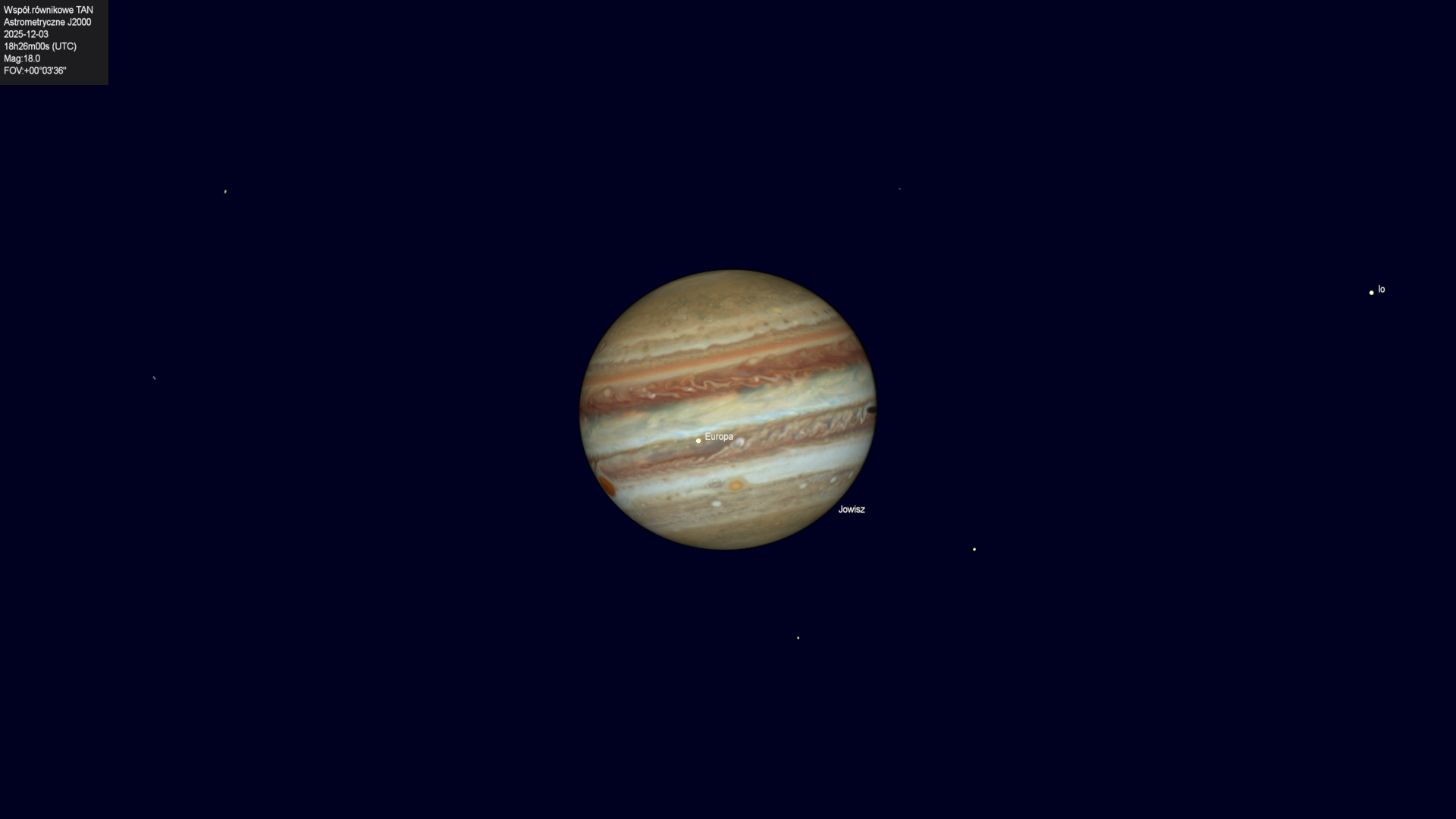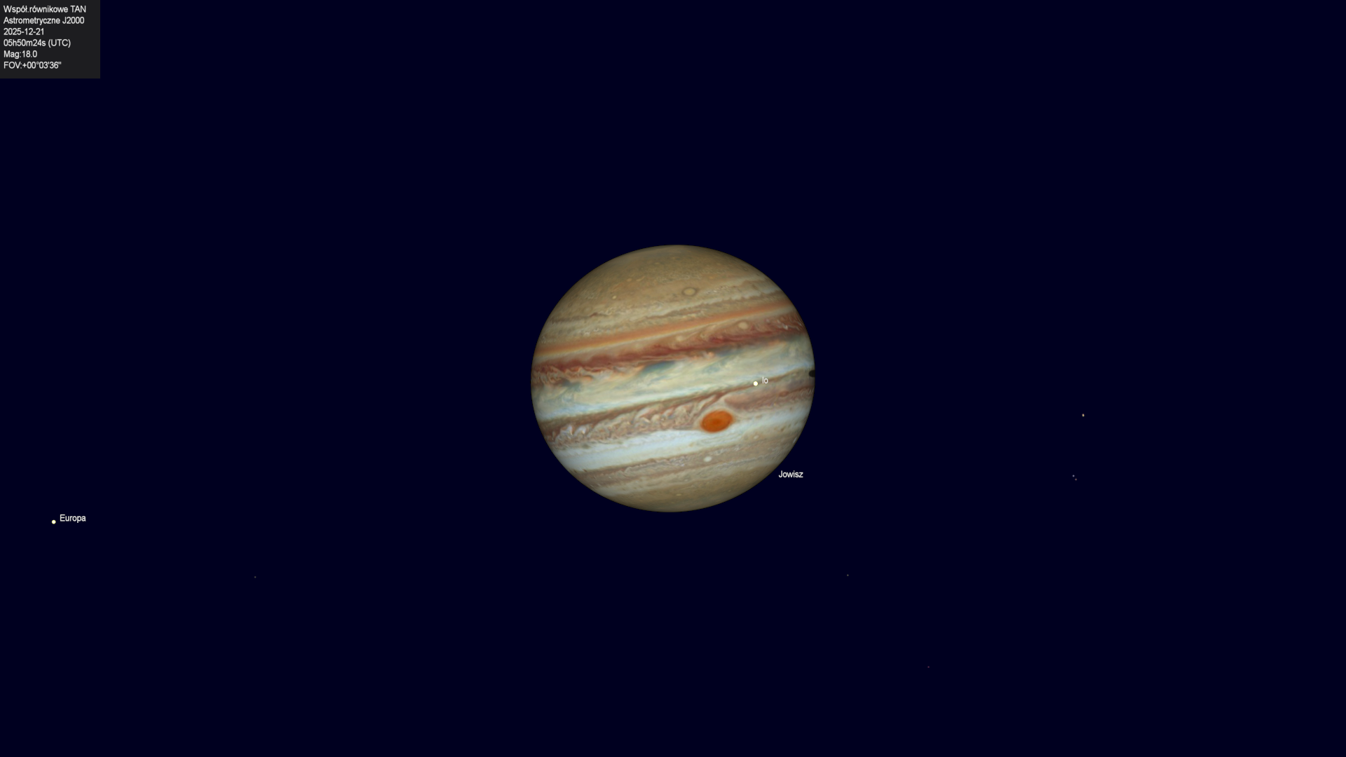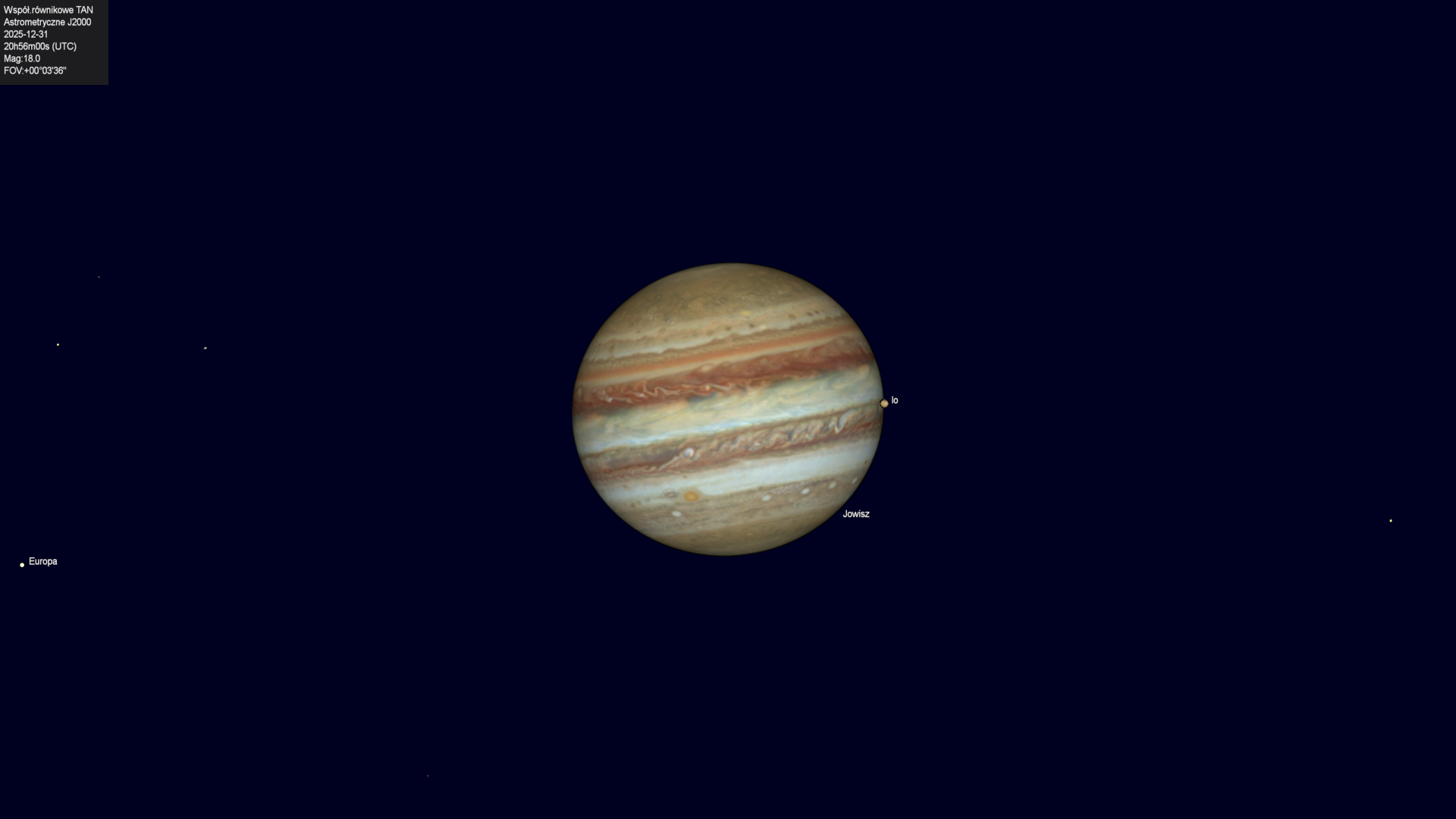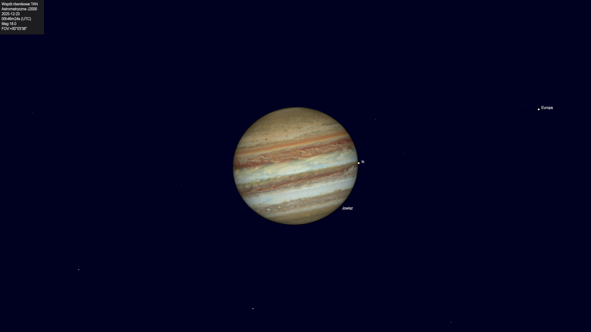 Koniec zakrycia księżyca Europy przez tarczę planety.
