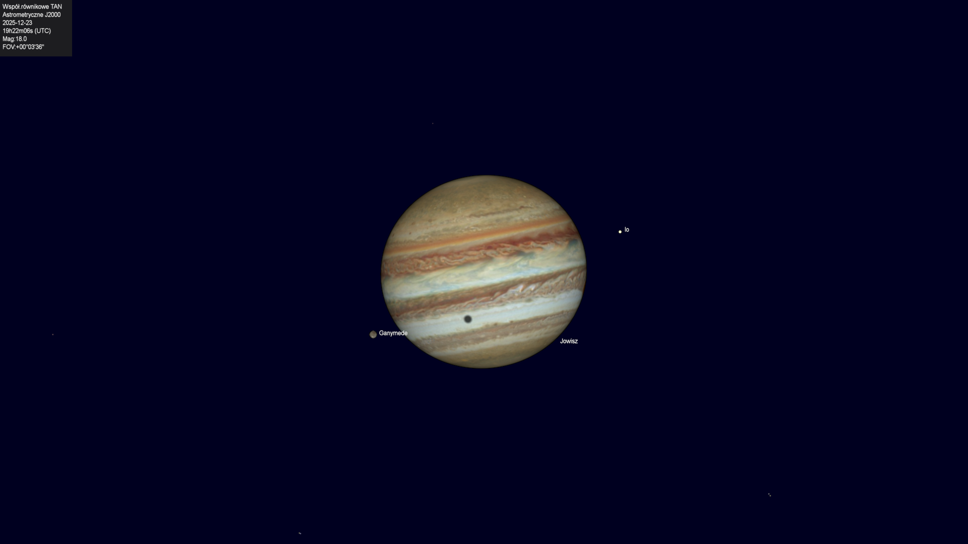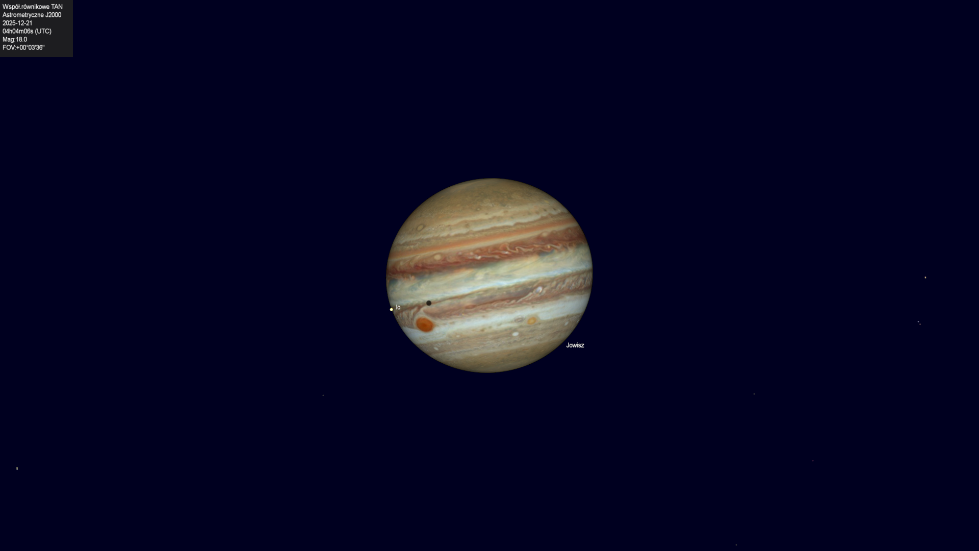 Koniec przejścia cienia księżyca Io na tle tarczy planety.