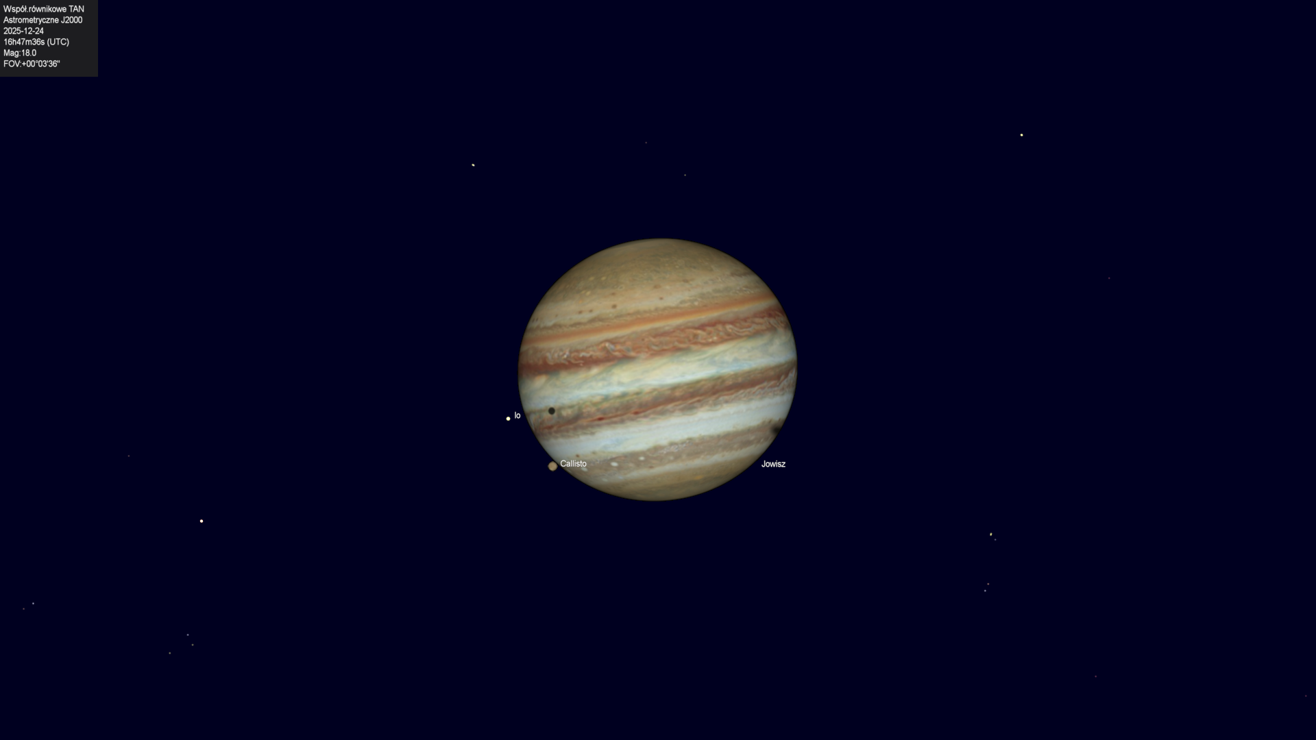 Początek przejścia cienia księżyca Kalisto na tle tarczy planety.