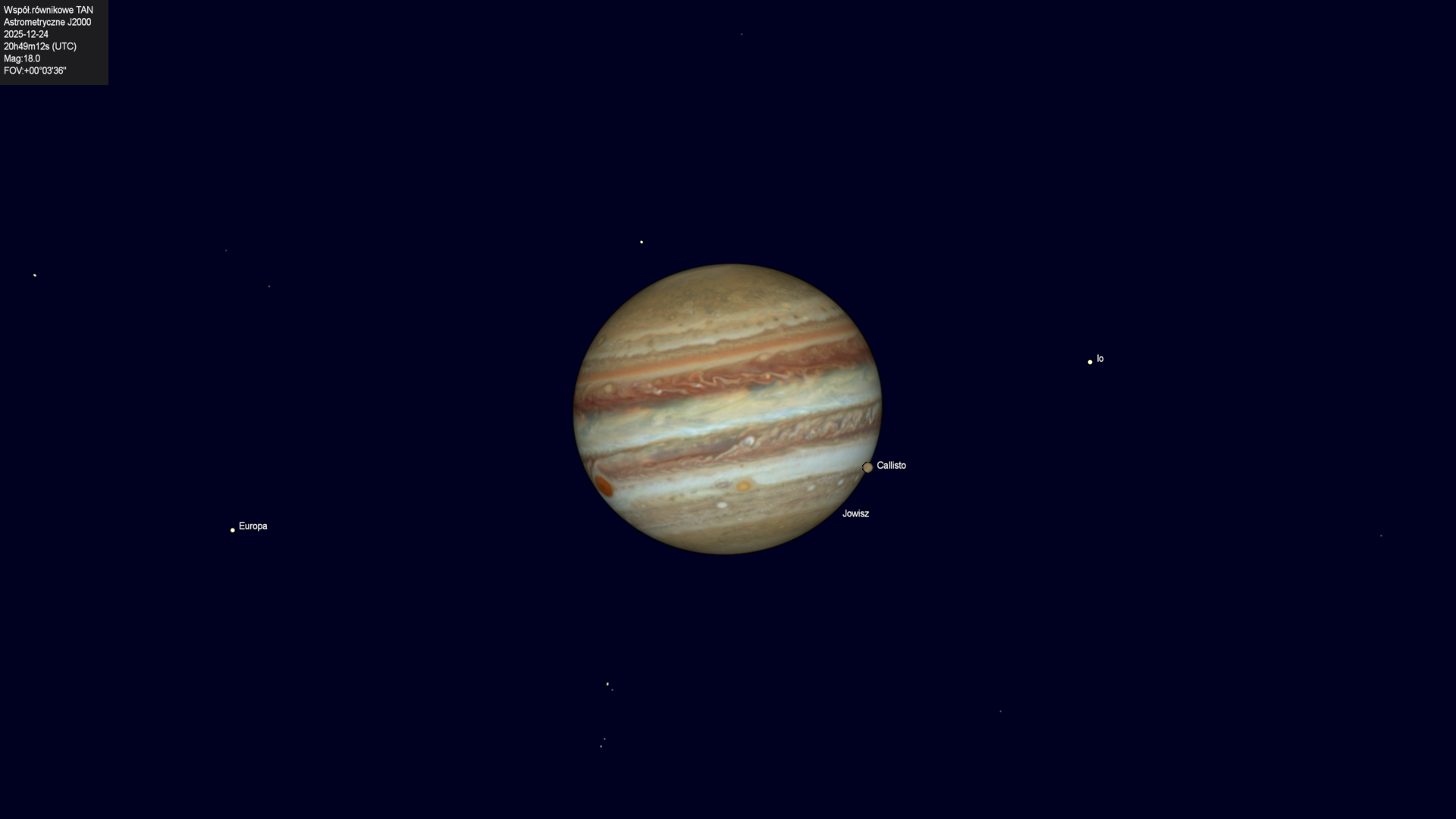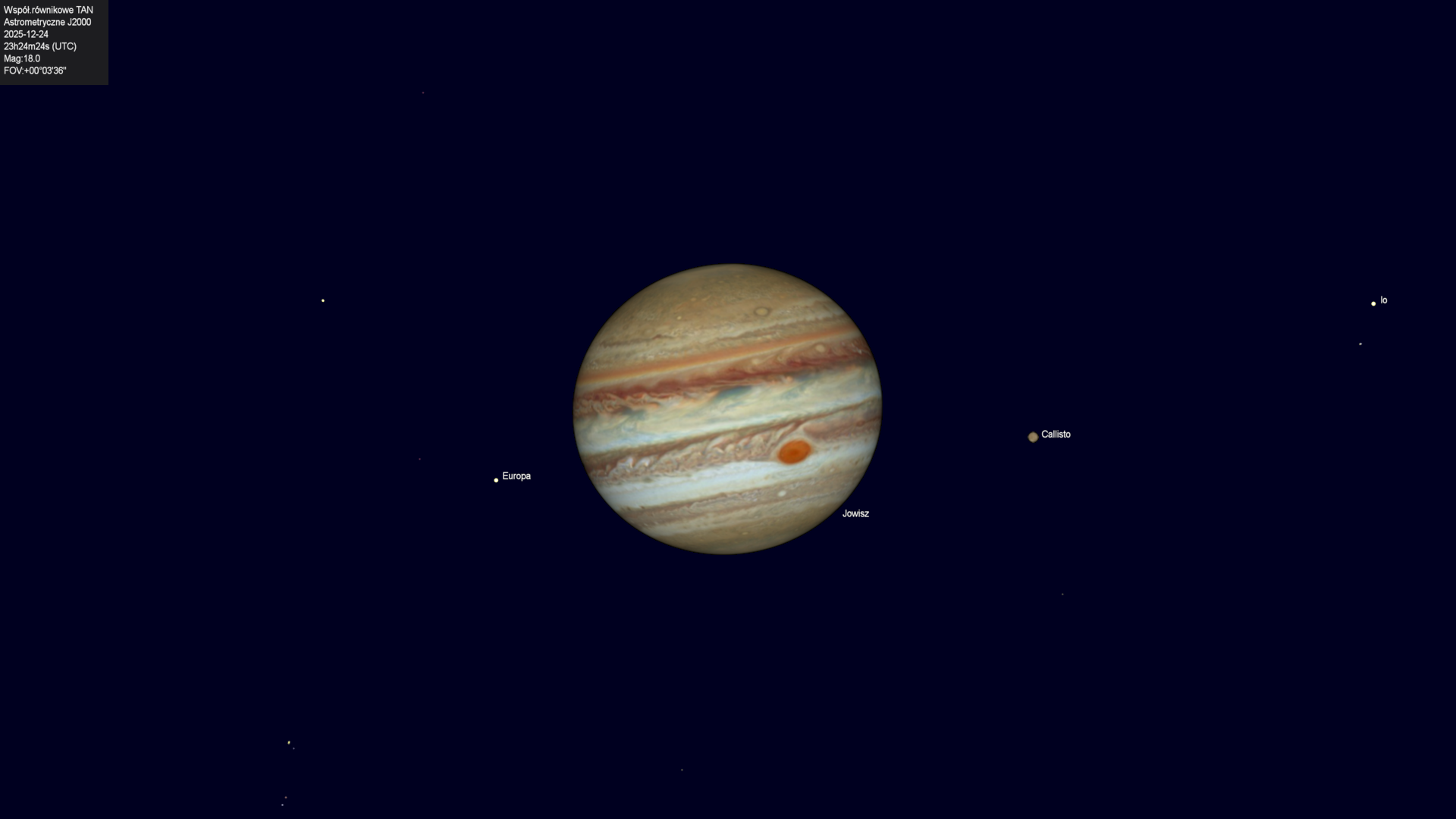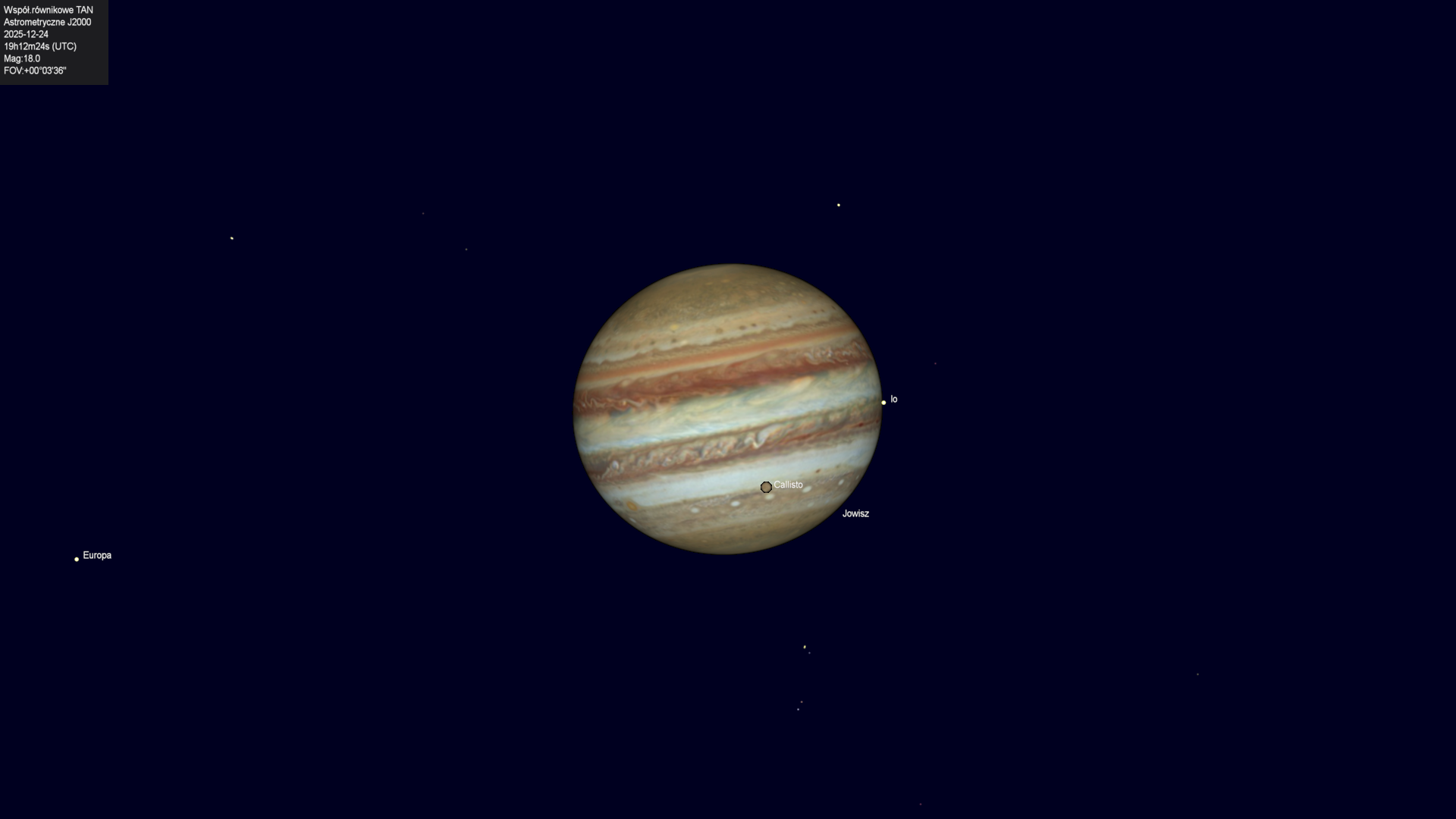 Początek przejścia księżyca Kalisto na tle tarczy planety.