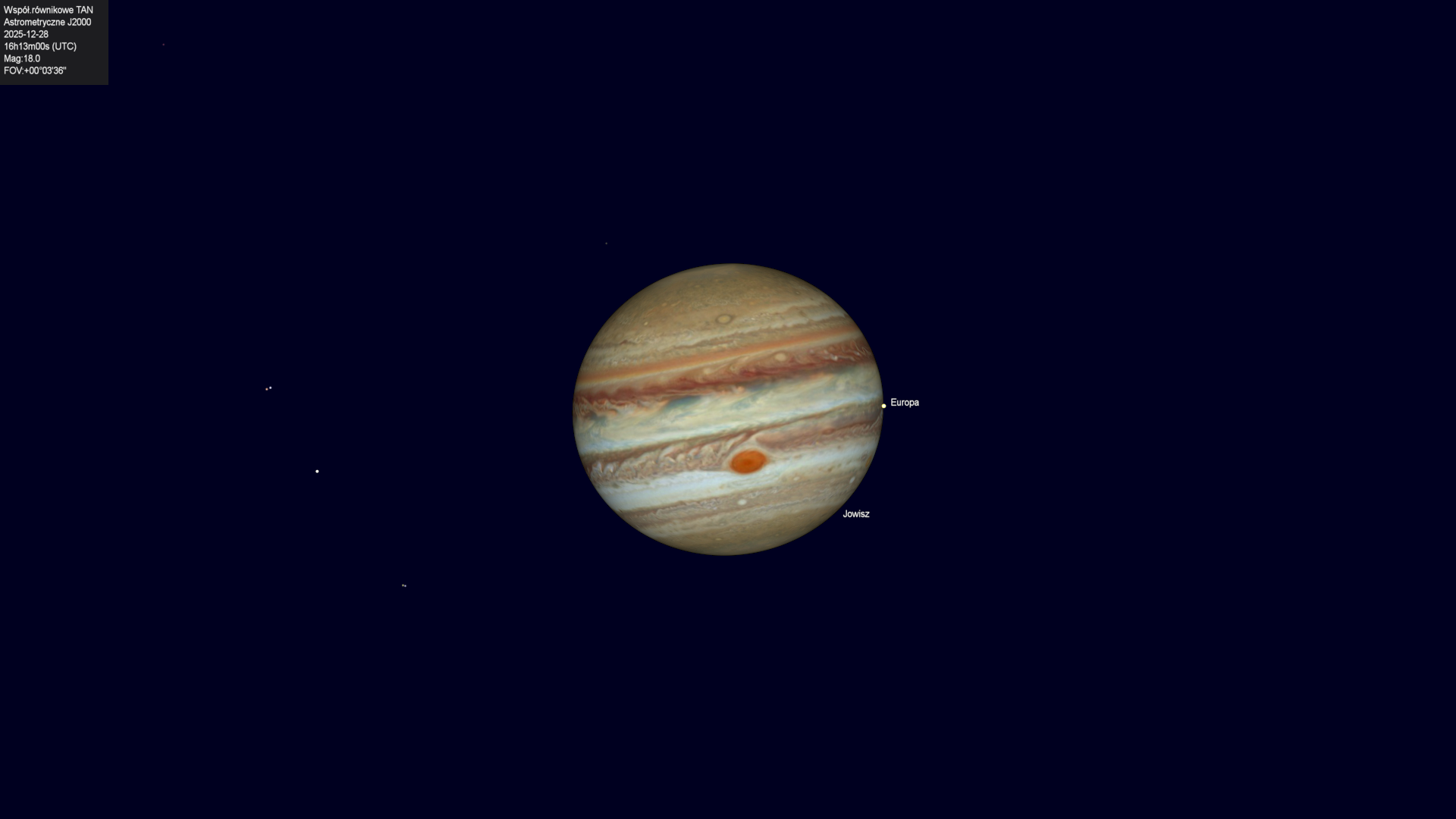 Koniec przejścia księżyca Europy na tle tarczy planety.