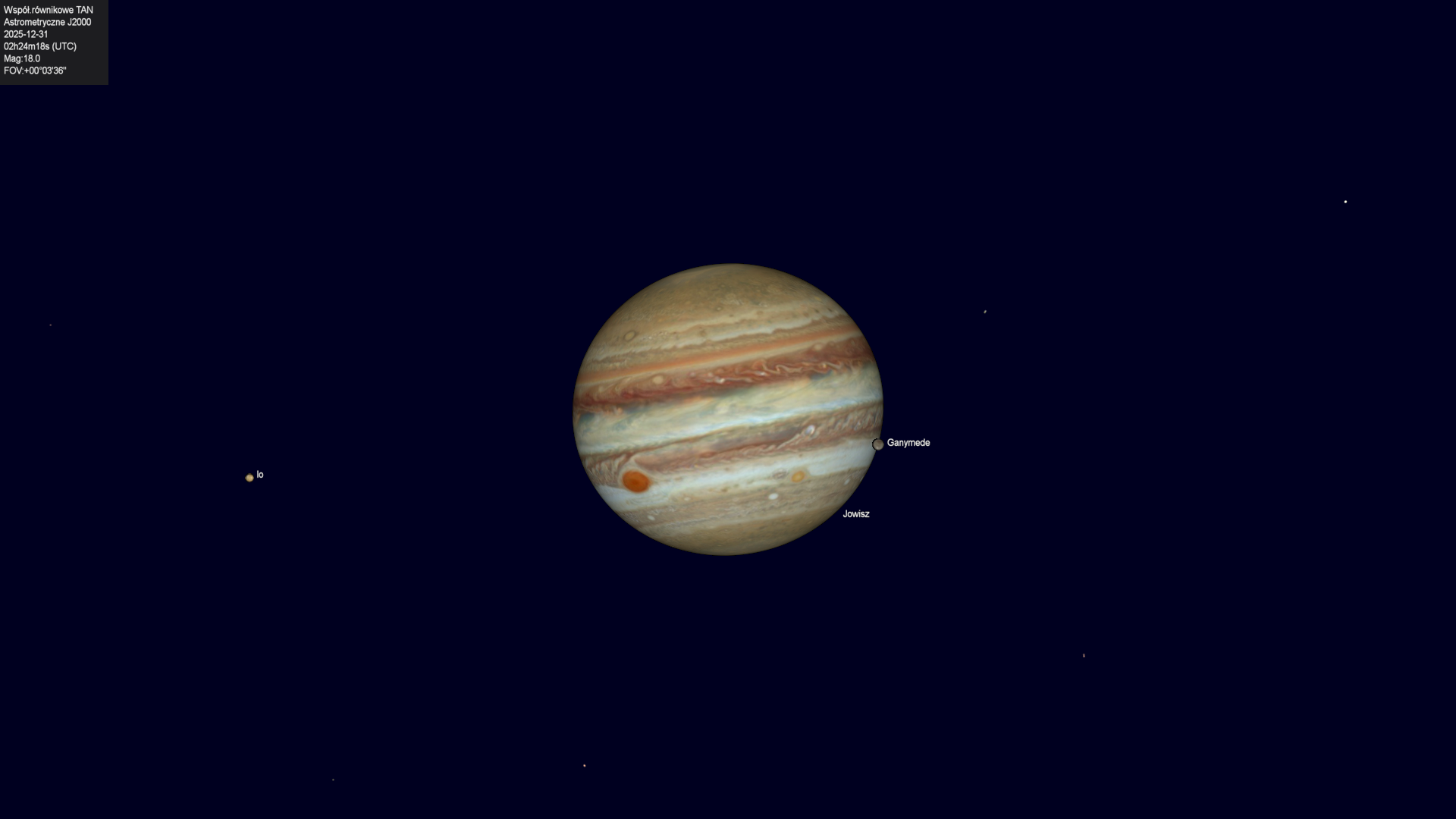 Koniec zakrycia księżyca Io przez tarczę planety.