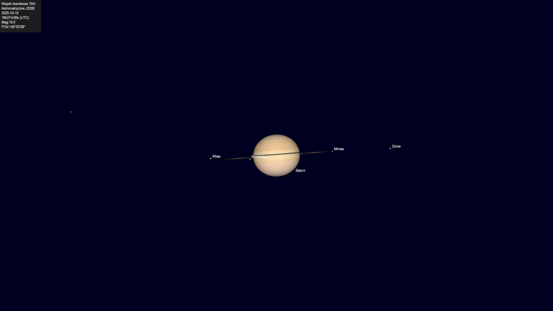 Początek przejścia cienia księżyca Dione na tle tarczy planety.