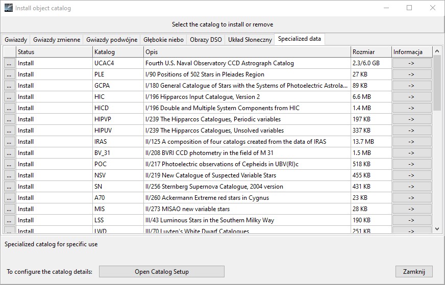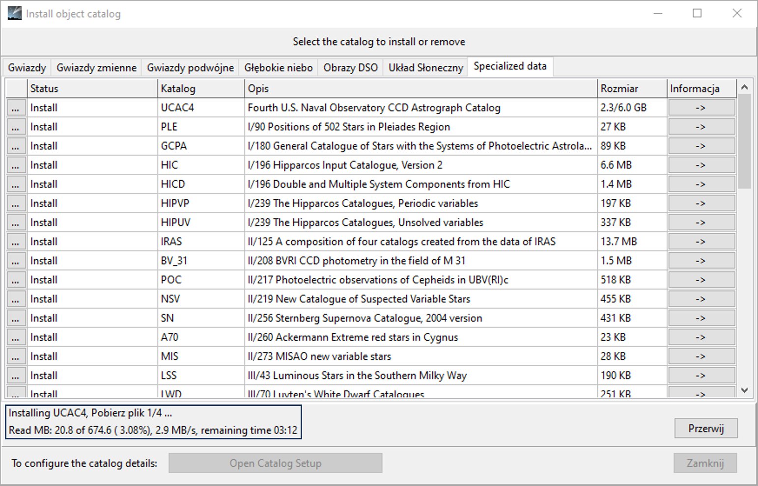 Gdy nam się otworzy kolejne okno programu Install object catalog i od razu jest otwarta zakładka Gwiazdy. Producent programu zaleca by instalować katalog GAIA DR3. Aby znaleźć interesujący katalog UCAC4 wchodzimy do zakładki Specjalized data.